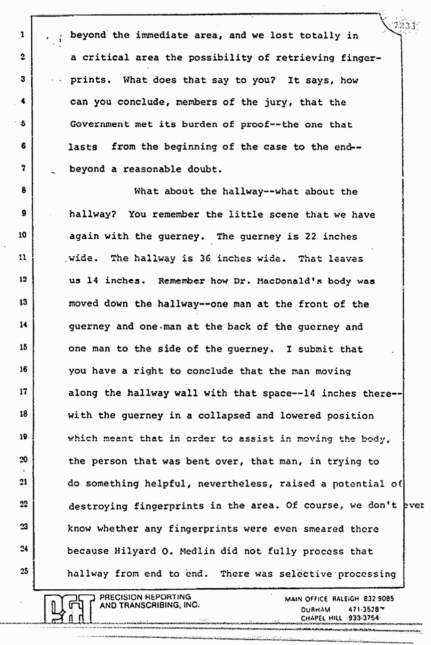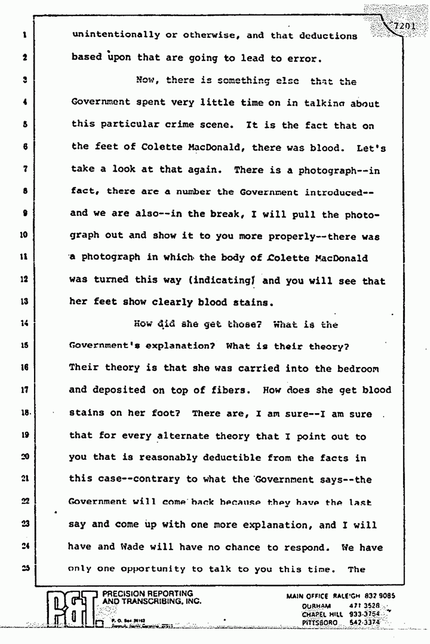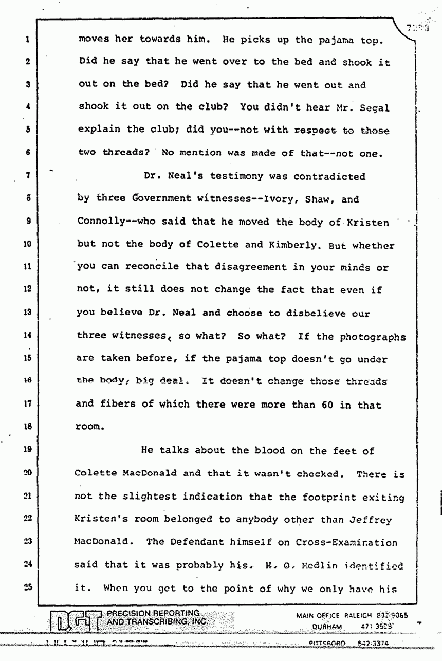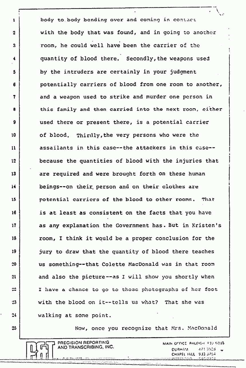 He talks about the blood on the feet of Colette MacDonald and that it wasn't checked. There is not the slightest indication that the footprint exiting Kristen's room belonged to anybody other than Jeffrey MacDonald. The Defendant himself on cross-examination said that it was probably his. H. O. Medlin identified it. When you get to the point of why we only have his word and why the picture didn't take it and Osterburg said, "Well if you can see it, you can take a picture of it," remember that Medlin said that he saw the ridge lines with a magnifying glass and the photography equipment didn't have that magnifying equipment. That is why the ridge lines weren't picked up, according to the very testimony of Medlin -- not because you couldn't see it.