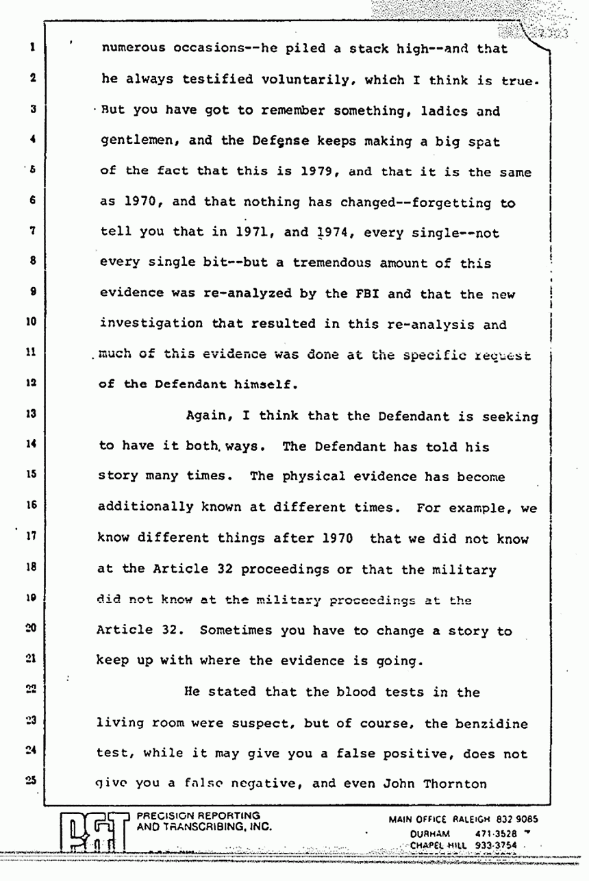 Ladies and gentlemen, the Defendant has testified and I would agree with the Defense that on and the shoulder area in which he numerous occasions -- he piled a stack high -- and that he always testified voluntarily, which I think is true. But you have got to remember something, ladies and gentlemen, and the Defense keeps making a big spat of the fact that this is 1979, and that it is the same as 1970, and that nothing has changed -- forgetting to tell you that in 1971, and 1974, every single -- not every single bit -- but a tremendous amount of this evidence was re-analyzed by the FBI and that the new investigation that resulted in this re-analysis and much of this evidence was done at the specific request of the Defendant himself.