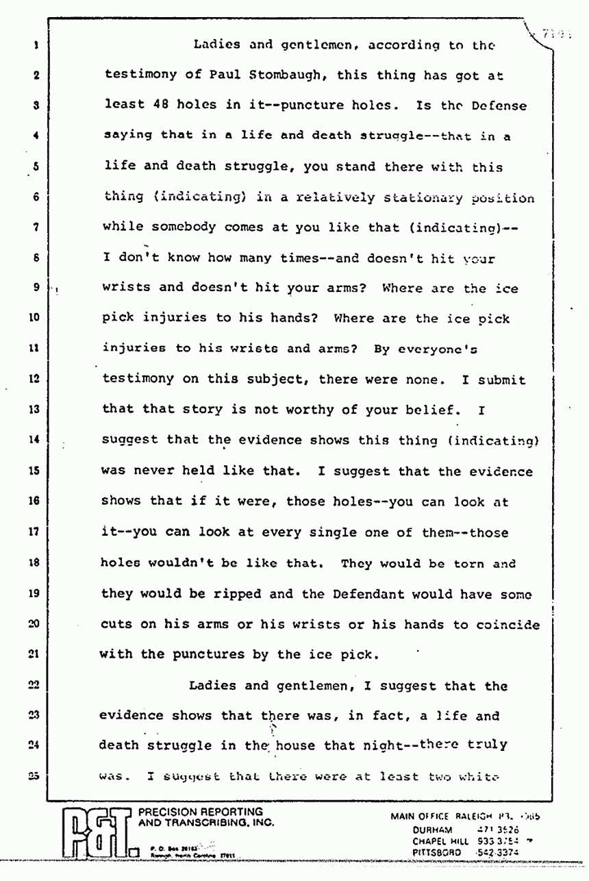 I would also ask you to remember that he tied up the ice pick as being consistent with the puncture holes in the pajama top and that in his opinion, the ice pick could have made the puncture holes in the pajama top. From the evidence, I would ask you to find that, in fact, this ice pick did make the puncture holes in the pajama top.