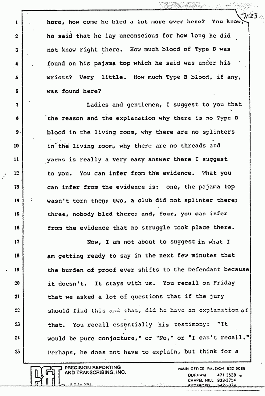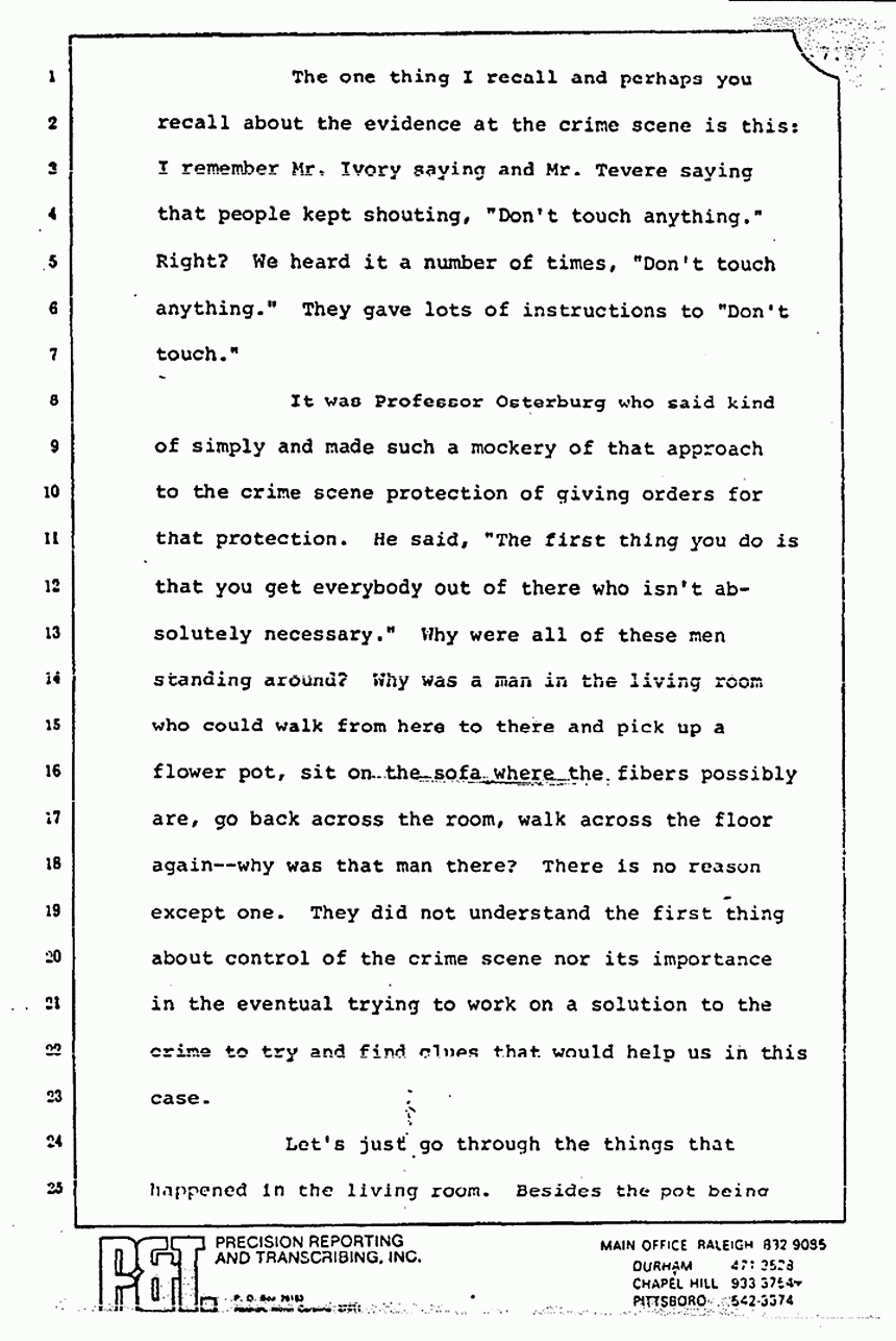 Ladies and gentlemen, I also think I heard him say that we contended that the pajama top was torn in Kristen's room and there weren't many threads there. No, we haven't said that the pajama top was torn in Kristen's room. I think there is a very valid explanation of why there were very few threads there. I think most of them simply had fallen off by the time it was taken there. I think that is why there were very few threads there.