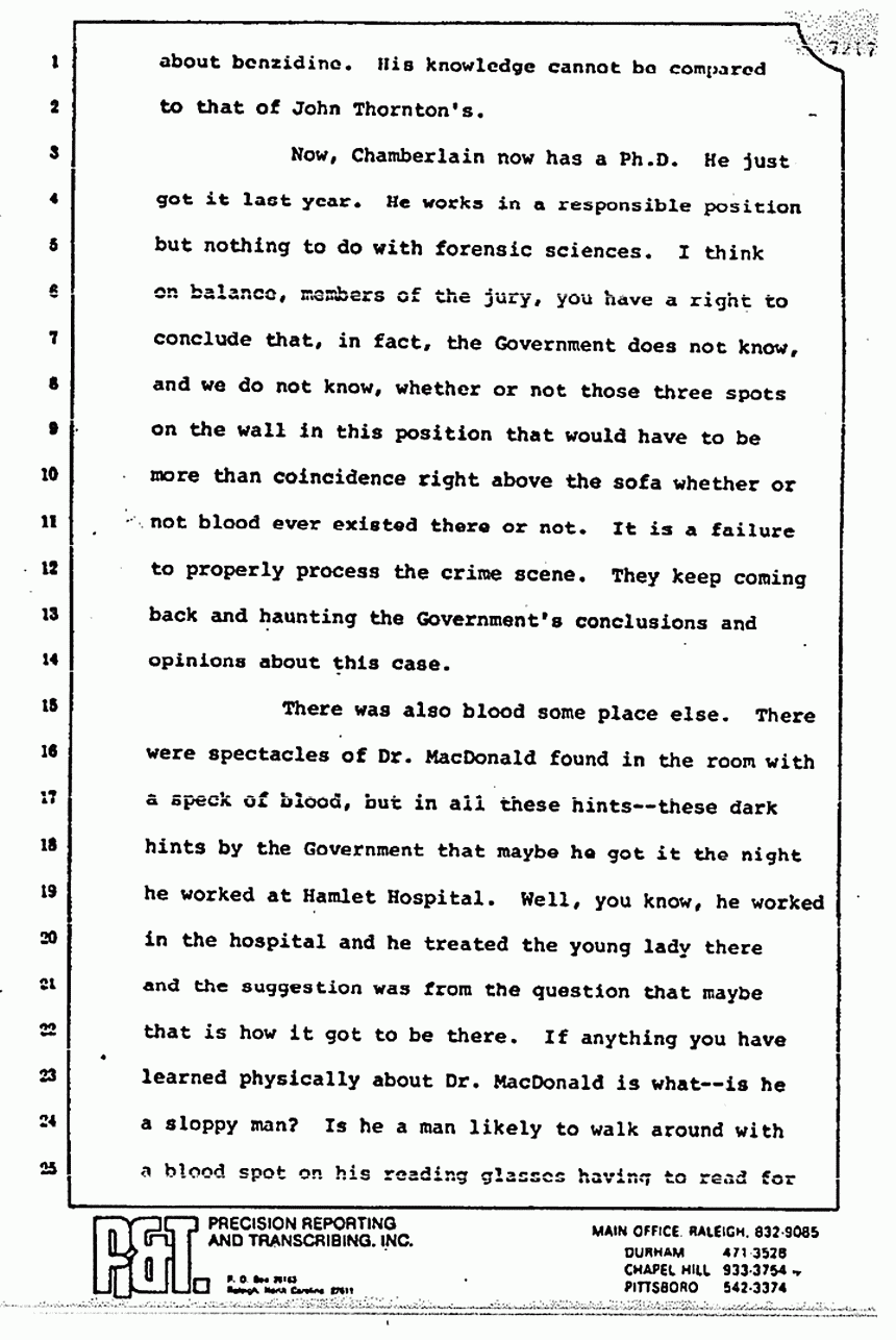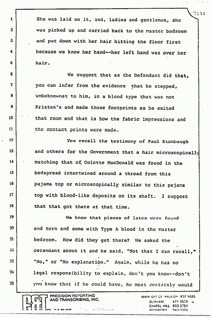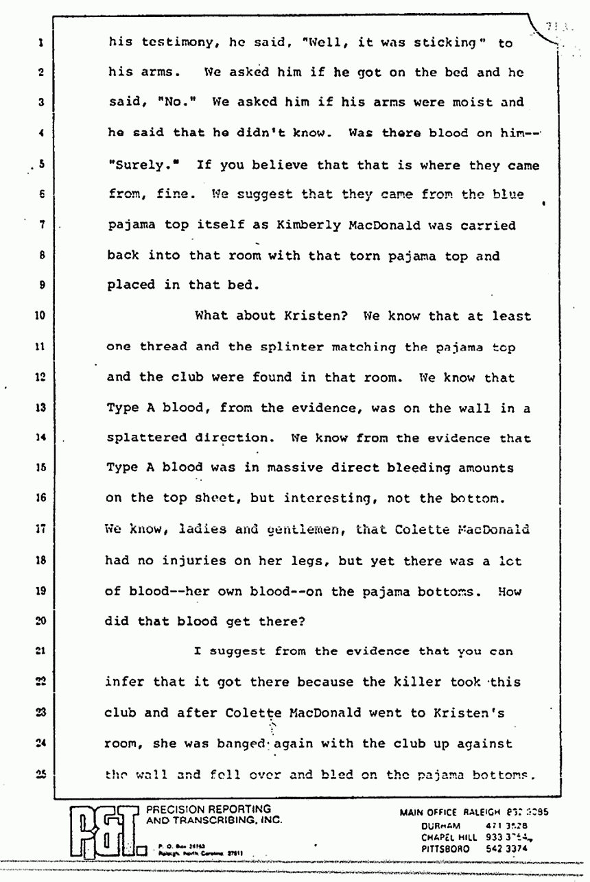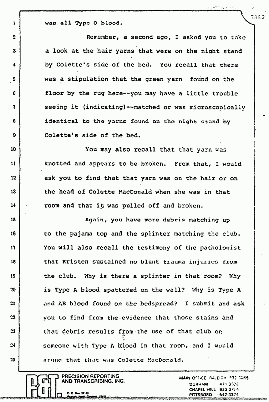 Again, you have more debris matching up to the pajama top and the splinter matching the club. You will also recall the testimony of the pathologist that Kristen sustained no blunt trauma injuries from the club. Why is there a splinter in that room? Why is Type A blood spattered on the wall? Why is Type A and AB blood found on the bedspread? I submit and ask you to find from the evidence that those stains and that debris results from the use of that club on someone with Type A blood in that room, and I would argue that that was Colette MacDonald.
