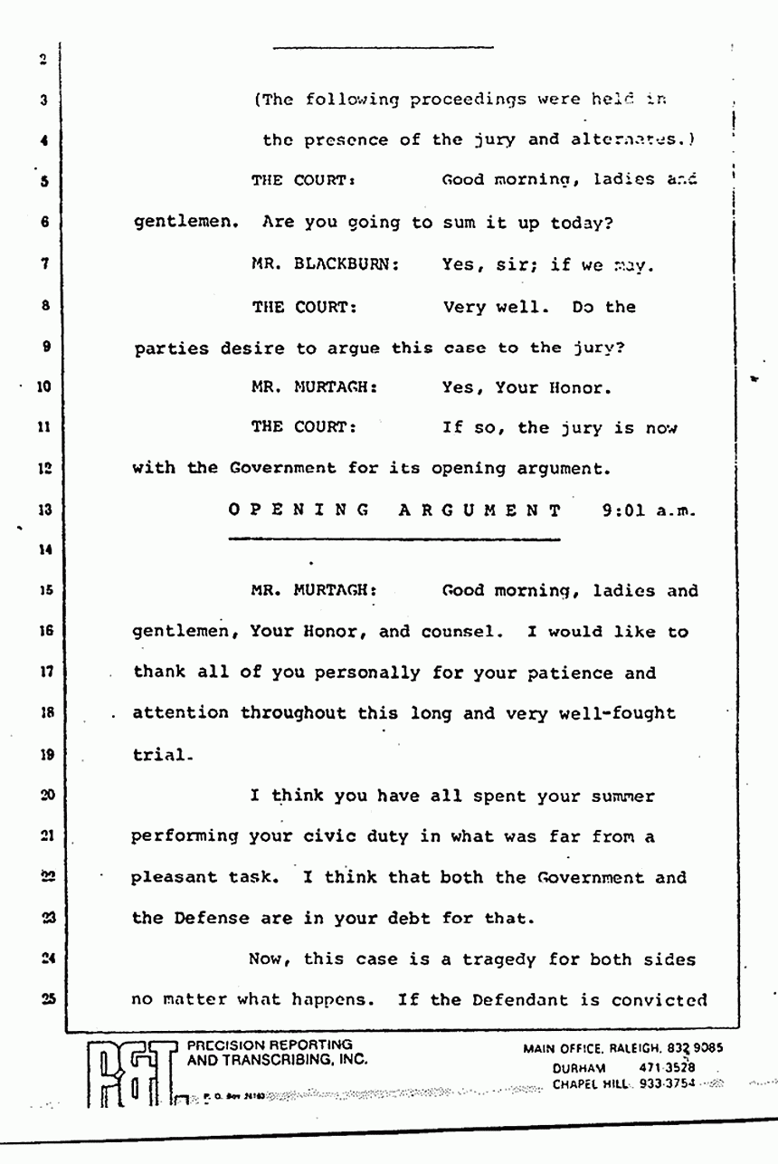 MR. SEGAL: I am going to do injustice to Helena Stoeckley's role because I think I want you to hear what Wade has said that he wanted to talk to you about. It is a question about the one remaining issue in this case.