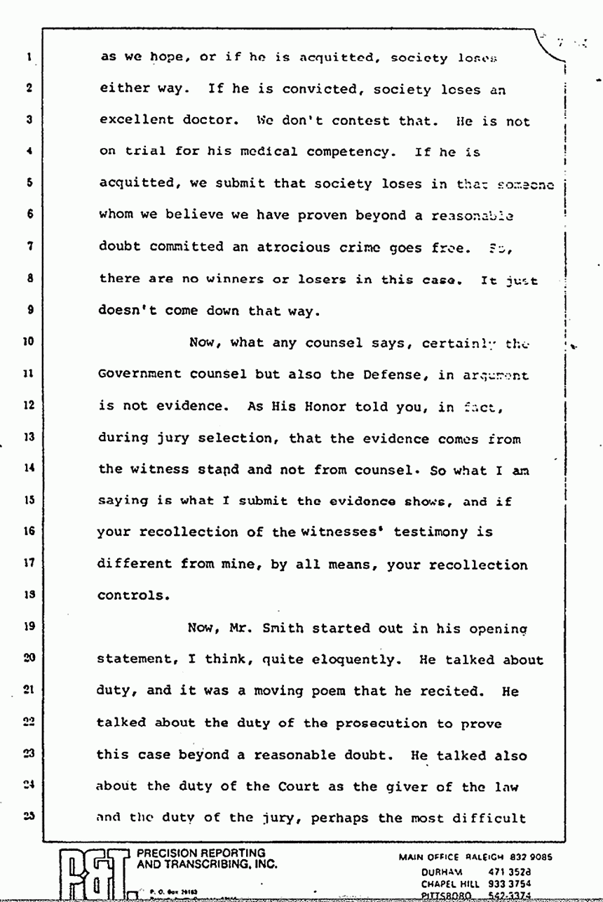 Now, this case is a tragedy for both sides no matter what happens. If the Defendant is convicted as we hope, or if he is acquitted, society loses either way. If he is convicted, society loses an excellent doctor. We don't contest that. He is not on trial for his medical competency. If he is acquitted, we submit that society loses in that someone whom we believe we have proven beyond a reasonable doubt committed an atrocious crime goes free. So, there are no winners or losers in this case. It just doesn't come down that way.
