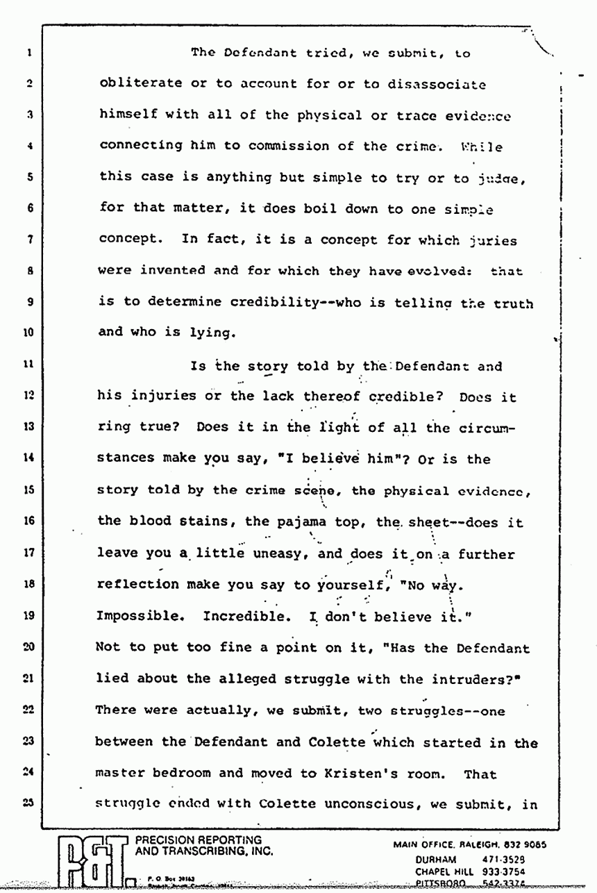 Is the story told by the Defendant and his injuries, or the lack thereof, credible? Does it ring true? Does it in the light of all the circumstances make you say, "I believe him"? Or is the story told by the crime scene, the physical evidence, the blood stains, the pajama top, the sheet -- does it leave you a little uneasy, and does it on a further reflection make you say to yourself, "No way. Impossible. Incredible. I don't believe it." Not to put too fine a point on it, "Has the Defendant lied about the alleged struggle with the intruders?" There were actually, we submit, two struggles -- one between the Defendant and Colette which started in the master bedroom and moved to Kristen's room. That struggle ended with Colette unconscious, we submit, in Kristen's bedroom.