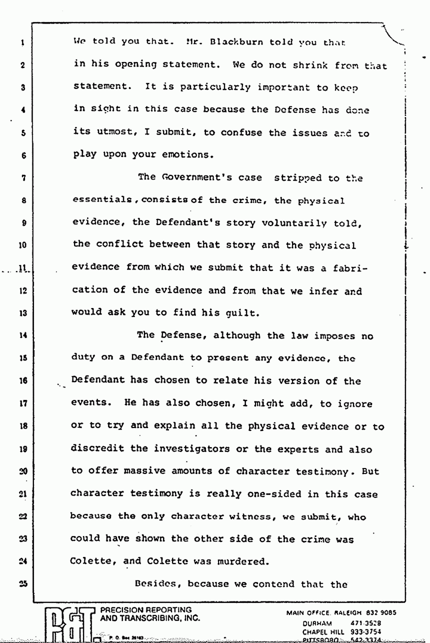 The Defense, although the law imposes no duty on a Defendant to present any evidence, the Defendant has chosen to relate his version of the events. He has also chosen, I might add, to ignore or to try and explain all the physical evidence or to discredit the investigators or the experts and also to offer massive amounts of character testimony. But character testimony is really one-sided in this case, because the only character witness, we submit, who could have shown the other side of the crime was Colette, and Colette was murdered.