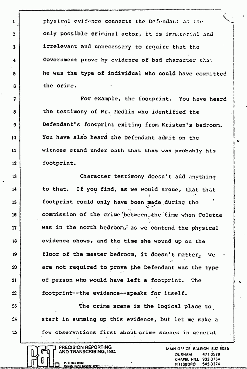 Character testimony doesn't add anything to that. If you find, as we would argue, that that footprint could only have been made during the commission of the crime between the time when Colette was in the north bedroom, as we contend the physical evidence shows, and the time she wound up on the floor of the master bedroom, it doesn't matter. We are not required to prove the Defendant was the type of person who would have left a footprint. The footprint -- the evidence -- speaks for itself.