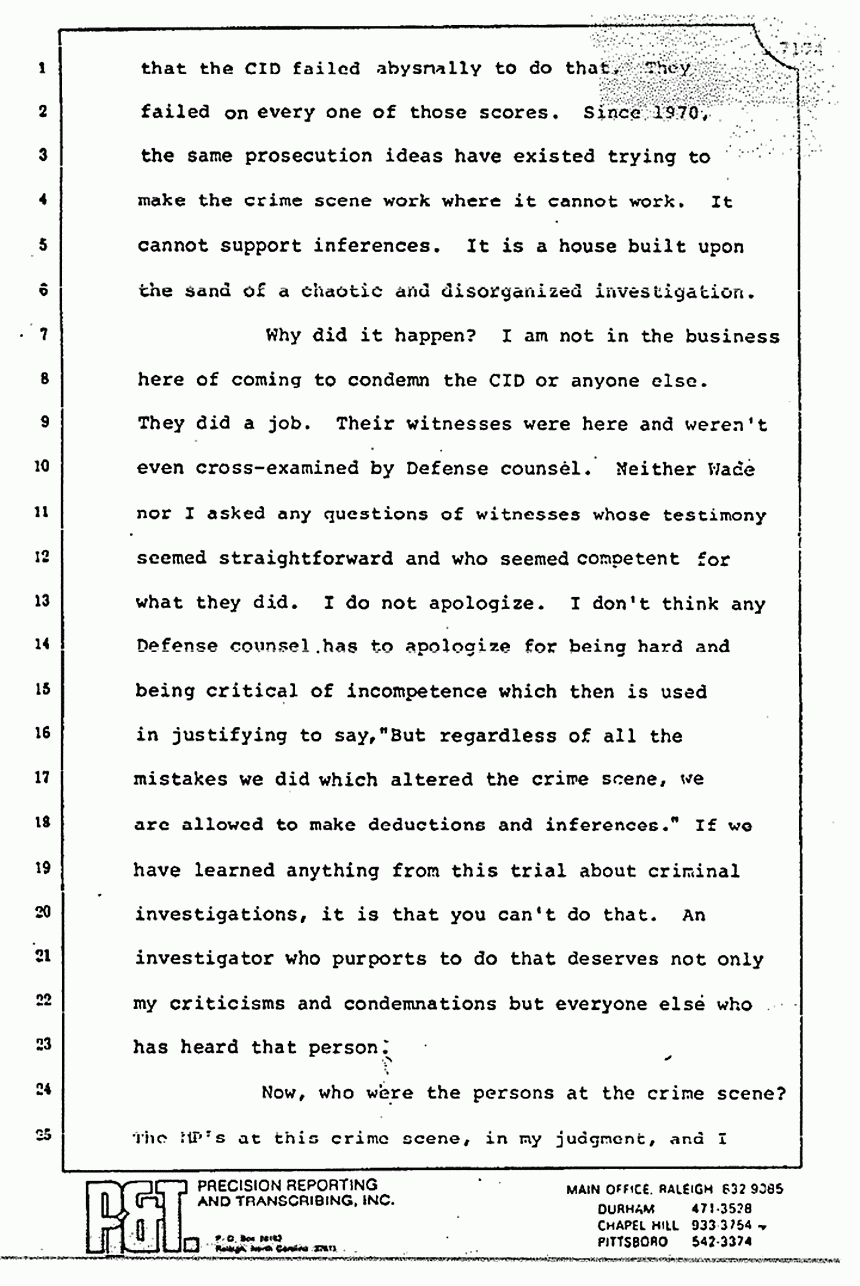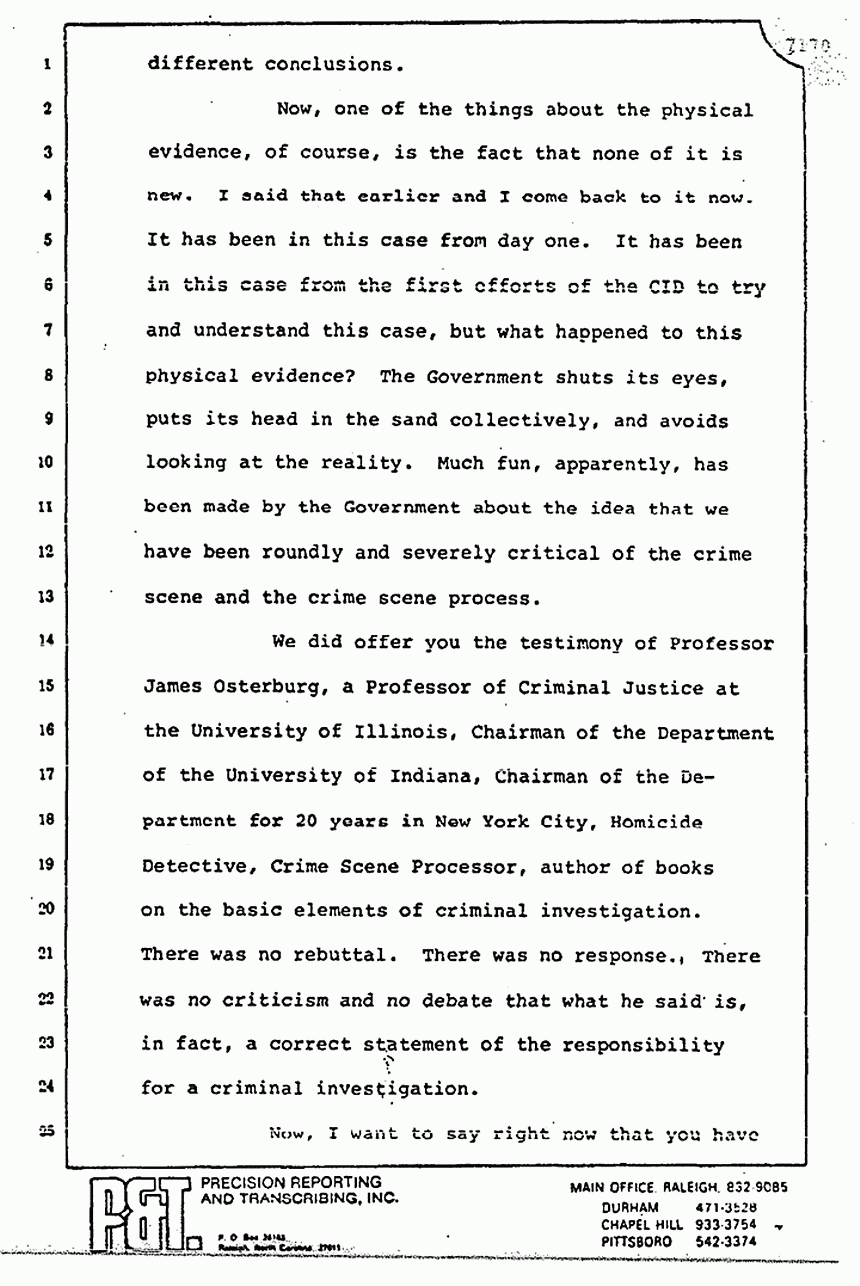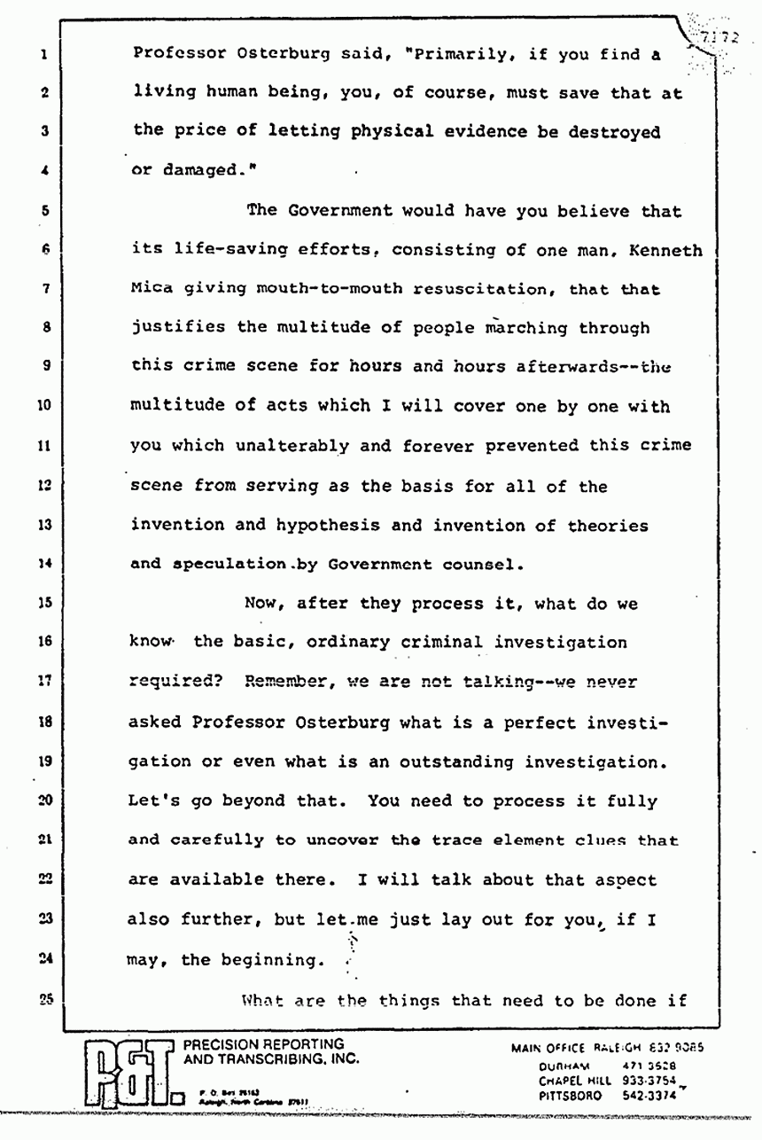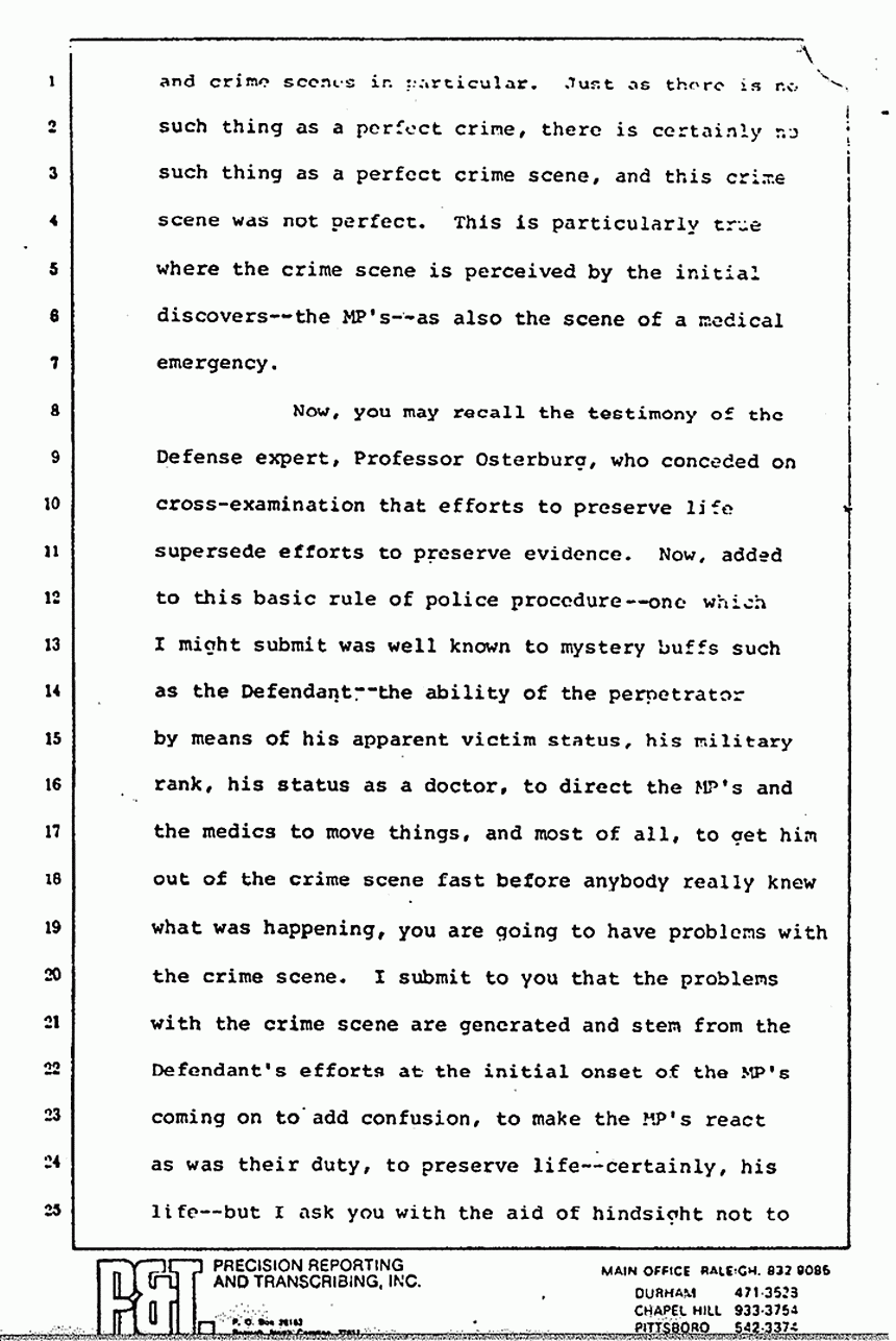 Now, you may recall the testimony of the Defense expert, Professor Osterburg, who conceded on cross-examination that efforts to preserve life supercede efforts to preserve evidence. Now, added to this basic rule of police procedure -- one which I might submit was well known to mystery buffs such as the Defendant -- the ability of the perpetrator by means of his apparent victim status, his military rank, his status as a doctor, to direct the MPs and the medics to move things, and most of all, to get him out of the crime scene fast before anybody really knew what was happening, you are going to have problems with the crime scene. I submit to you that the problems with the crime scene are generated and stem from the Defendant's efforts, at the initial onset of the MPs coming on, to add confusion, to make the MPs react as was their duty, to preserve life -- certainly, his life -- but I ask you with the aid of hindsight not to hold the MPs and the CID agents to a standard of perfection because just as there is no such thing -- excuse me -- because what was lost does not change what was found. Things were lost, but things were also found. What was done does not change what was not done.