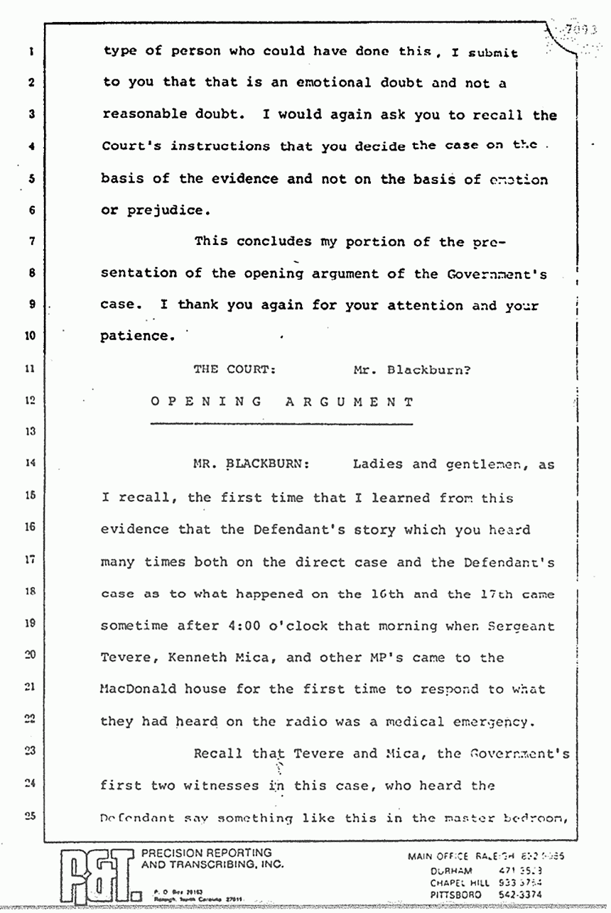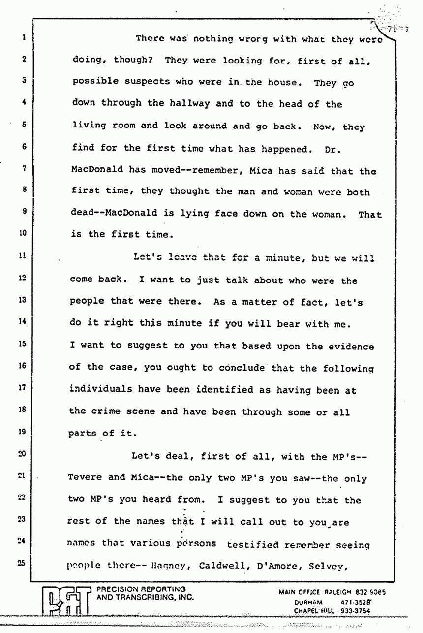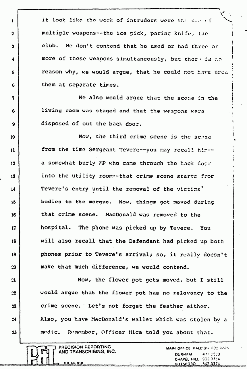 Now, the third crime scene is the scene from the time Sergeant Tevere -- you may recall him -- a somewhat burly MP who came through the back door into the utility room -- that crime scene starts from Tevere's entry until the removal of the victims' bodies to the morgue. Now, things got moved during that crime scene. MacDonald was removed to the hospital. The phone was picked up by Tevere. You will also recall that the Defendant had picked up both phones prior to Tevere's arrival; so, it really doesn't make that much difference, we would contend.
