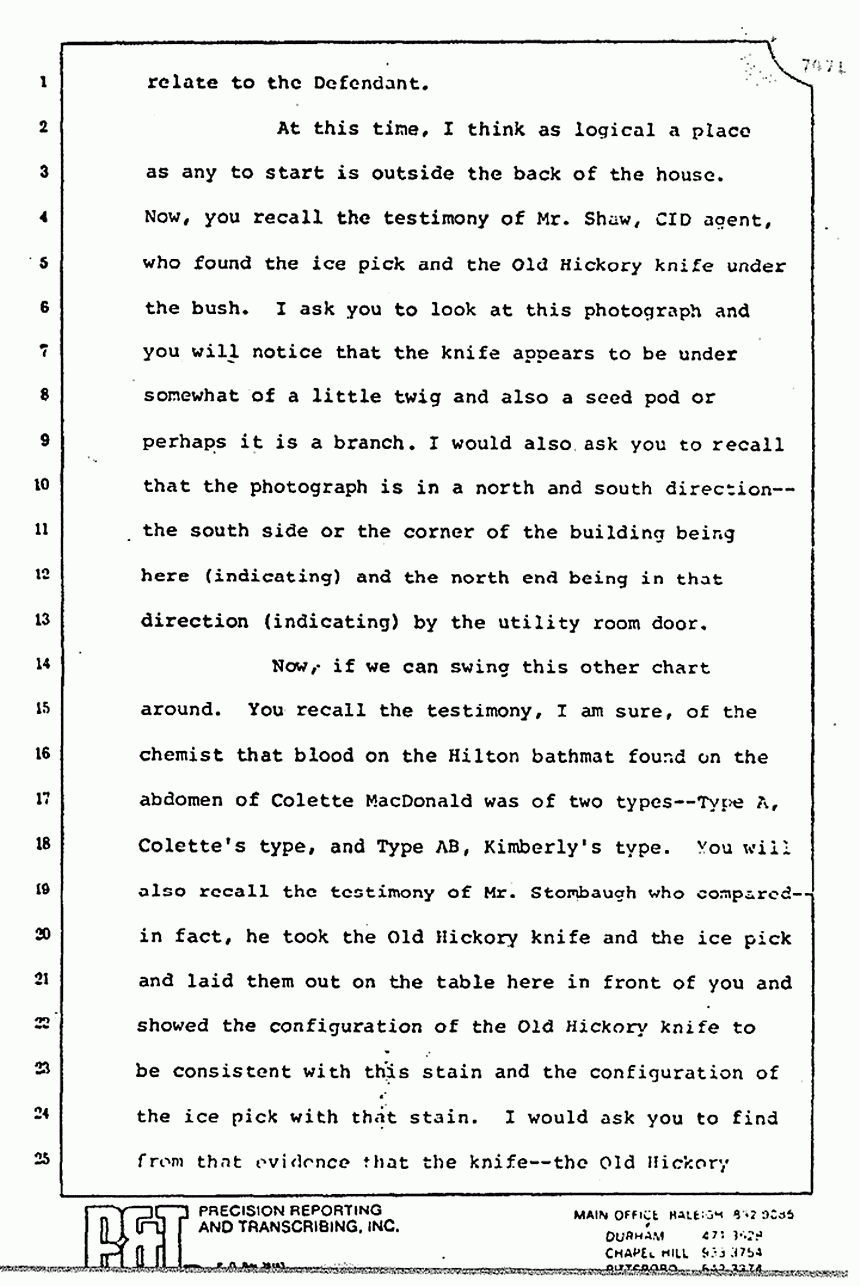 Now, if we can swing this other chart around. You recall the testimony, I am sure, of the chemist that blood on the Hilton bathmat found on the abdomen of Colette MacDonald was of two types -- Type A, Colette's type, and Type AB, Kimberly's type. You will also recall the testimony of Mr. Stombaugh who compared -- in fact, he took the Old Hickory knife and the ice pick and laid them out on the table here in front of you and showed the configuration of the Old Hickory knife to be consistent with this stain and the configuration of the ice pick with that stain. I would ask you to find from that evidence that the knife -- the Old Hickory knife -- and the ice pick were wiped off on the Hilton bathmat.