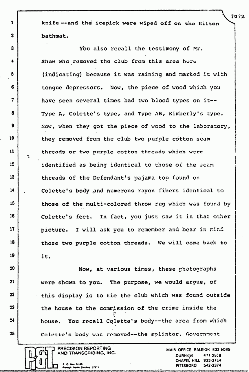 Now, at various times, these photographs were shown to you. The purpose, we would argue, of this display is to tie the club which was found outside the house to the commission of the crime inside the house. You recall Colette's body -- the area from which Colette's body was removed -- the splinter, Government Exhibit 125, which Dr. Chamberlain tested for blood on it and it was Type A blood. We would argue that it was Colette's blood. The splinter was later fitted back into the club which was found outside the house. We would argue and ask you to find from the evidence that that shows that that club was used on Colette MacDonald in the master bedroom.
