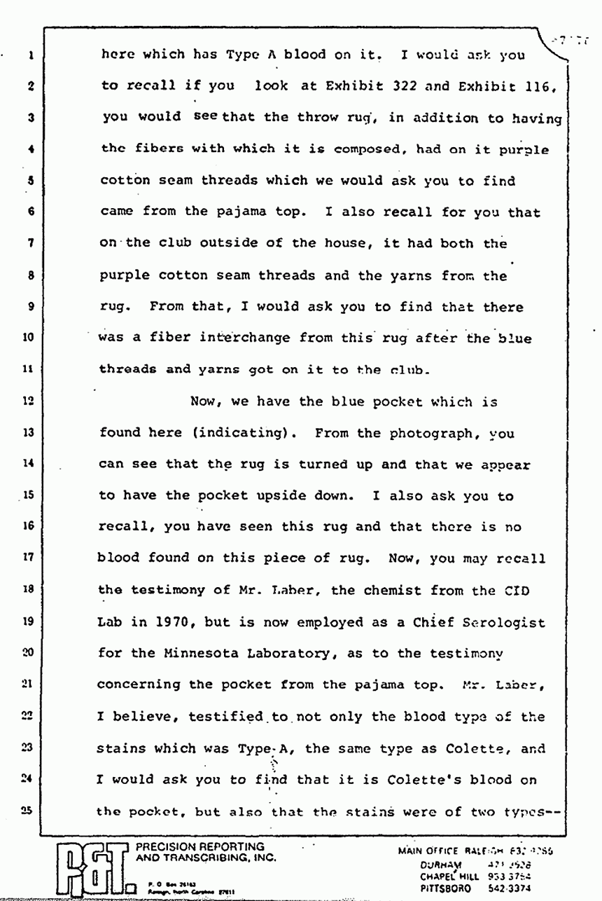 Now, we have the blue pocket which is found here (indicating). From the photograph, you can see that the rug is turned up and that we appear to have the pocket upside down. I also ask you to recall, you have seen this rug and that there is no blood found on this piece of rug. Now, you may recall the testimony of Mr. Laber, the chemist from the CID Lab in 1970, but is now employed as a Chief Serologist for the Minnesota Laboratory, as to the testimony concerning the pocket from the pajama top. Mr. Laber, I believe, testified to not only the blood type of the stains which was Type A, the same type as Colette, and I would ask you to find that it is Colette's blood on the pocket, but also that the stains were of two types -- that there was a smear on Area Two which is white beading and that the larger stains were contact or soaking stains. From that, I would ask you to find that Colette's blood was on the pocket of the pajama top before it was torn off because as you recall, the stains do not penetrate the double layers of the fabric by the seams.