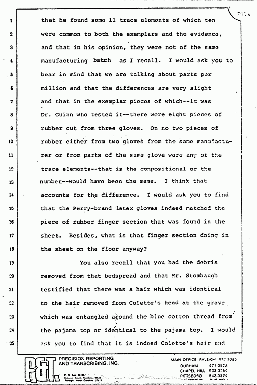 You may recall that the Defense expert testified after using a different procedure in 1979, that he found some 11 trace elements of which ten were common to both the exemplars and the evidence, and that in his opinion, they were not of the same manufacturing batch, as I recall. I would ask you to bear in mind that we are talking about parts per million and that the differences are very slight and that in the exemplar pieces of which -- it was Dr. Guinn who tested it -- there were eight pieces of rubber cut from three gloves. On no two pieces of rubber, either from two gloves from the same manufacturer or from parts of the same glove, were any of the trace elements -- that is, the compositional or the number -- would have been the same. I think that accounts for the difference. I would ask you to find that the Perry-brand latex gloves indeed matched the piece of rubber finger section that was found in the sheet. Besides, what is that finger section doing in the sheet on the floor anyway?