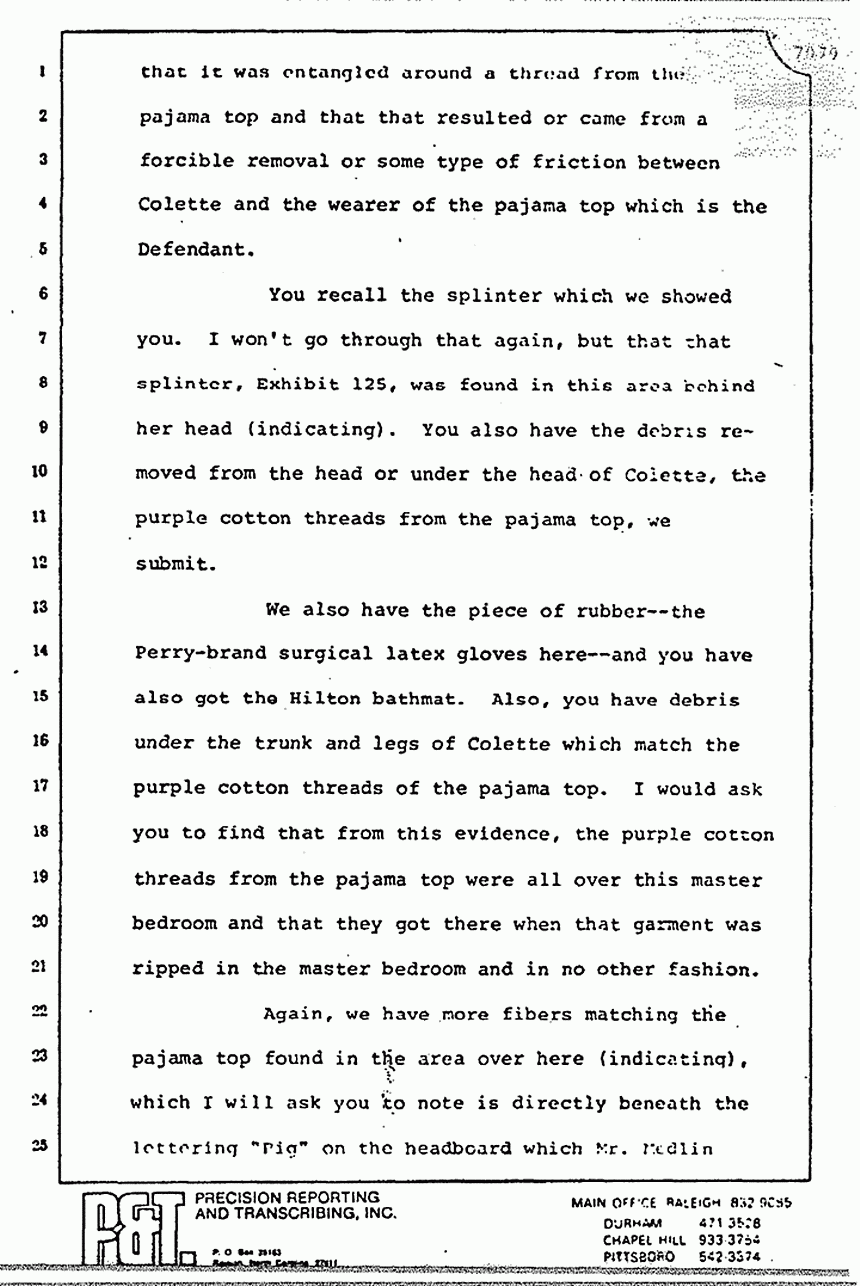 Again, we have more fibers matching the pajama top found in the area over here (indicating), which I will ask you to note is directly beneath the lettering "Pig" on the headboard, which Mr. Medlin testified to could have been made by somebody using two fingers and wearing a rubber glove. Again, I will recall or ask you to recall that the finger section of the rubber glove with Type A blood was found in the sheet. I will also ask you to note that you have these hair yarns, or I guess you would call them ribbons, that were found on the night stand by Colette's side of the bed. I would ask you to recall that because we will tie that in in a minute.