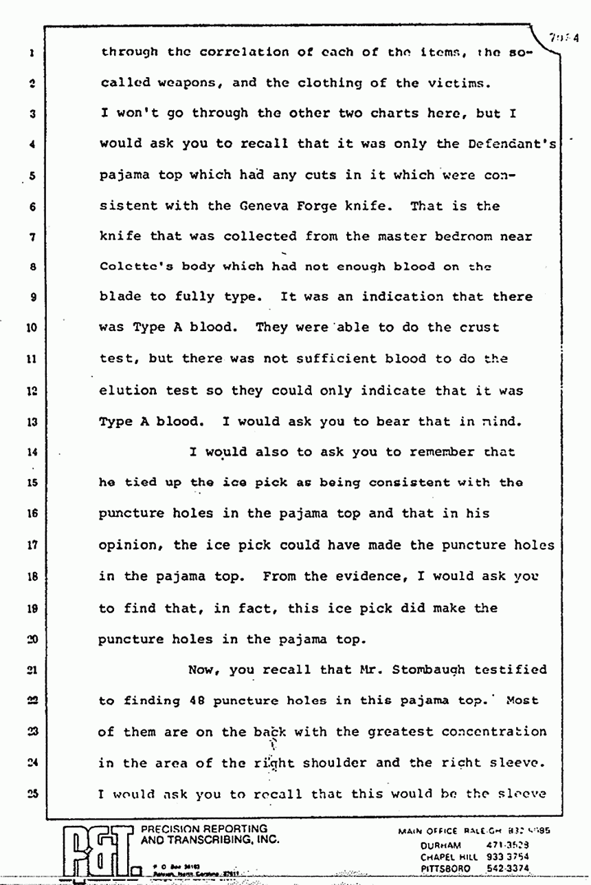 Now, you recall that Mr. Stombaugh went through the correlation of each of the items, the so-called weapons, and the clothing of the victims. I won't go through the other two charts here, but I would ask you to recall that it was only the Defendant's pajama top which had any cuts in it which were consistent with the Geneva Forge knife. That is the knife that was collected from the master bedroom near Colette's body, which had not enough blood on the blade to fully type. It was an indication that there was Type A blood. They were able to do the crust test, but there was not sufficient blood to do the elution test so they could only indicate that it was Type A blood. I would ask you to bear that in mind.