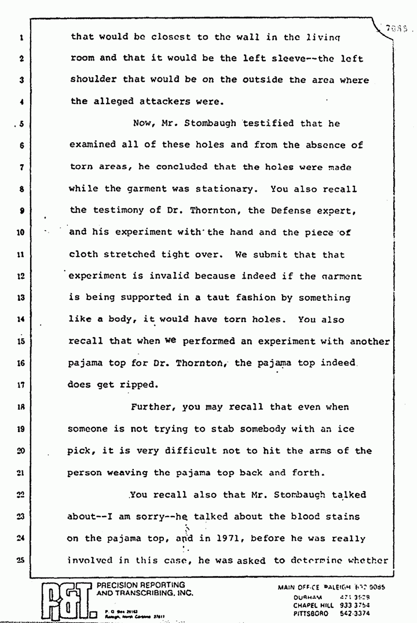 Now, Mr. Stombaugh testified that he examined all of these holes and from the absence of torn areas, he concluded that the holes were made while the garment was stationary. You also recall the testimony of Dr. Thornton, the Defense expert, and his experiment with the ham and the piece of cloth stretched tight over. We submit that that experiment is invalid because indeed if the garment is being supported in a taut fashion by something like a body, it would have torn holes. You also recall that when we performed an experiment with another pajama top for Dr. Thornton, the pajama top indeed does get ripped.