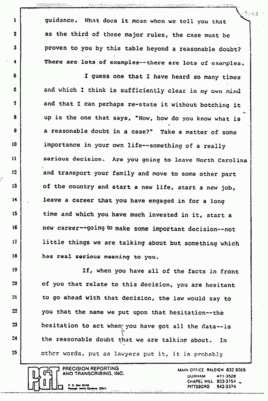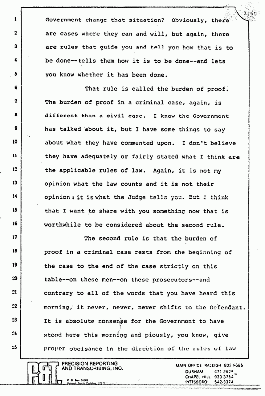 He is not on trial for being a bad doctor. Truth shall prevail, but only if the jury requires the Government to prove each and every element of the offense beyond a reasonable doubt but not -- not -- beyond any doubt whatsoever, because as His Honor, Judge Dupree, instructed you during jury selection, very few things are capable of proof to an absolute certainty. Again, truth shall prevail only if the jury requires that the Government prove that the Defendant committed a crime beyond a reasonable doubt; however, the Government is not required to prove beyond a reasonable doubt the innocence of everyone that was within driving distance of Fort Bragg on the night of February 16th and 17th. That is not our purpose.