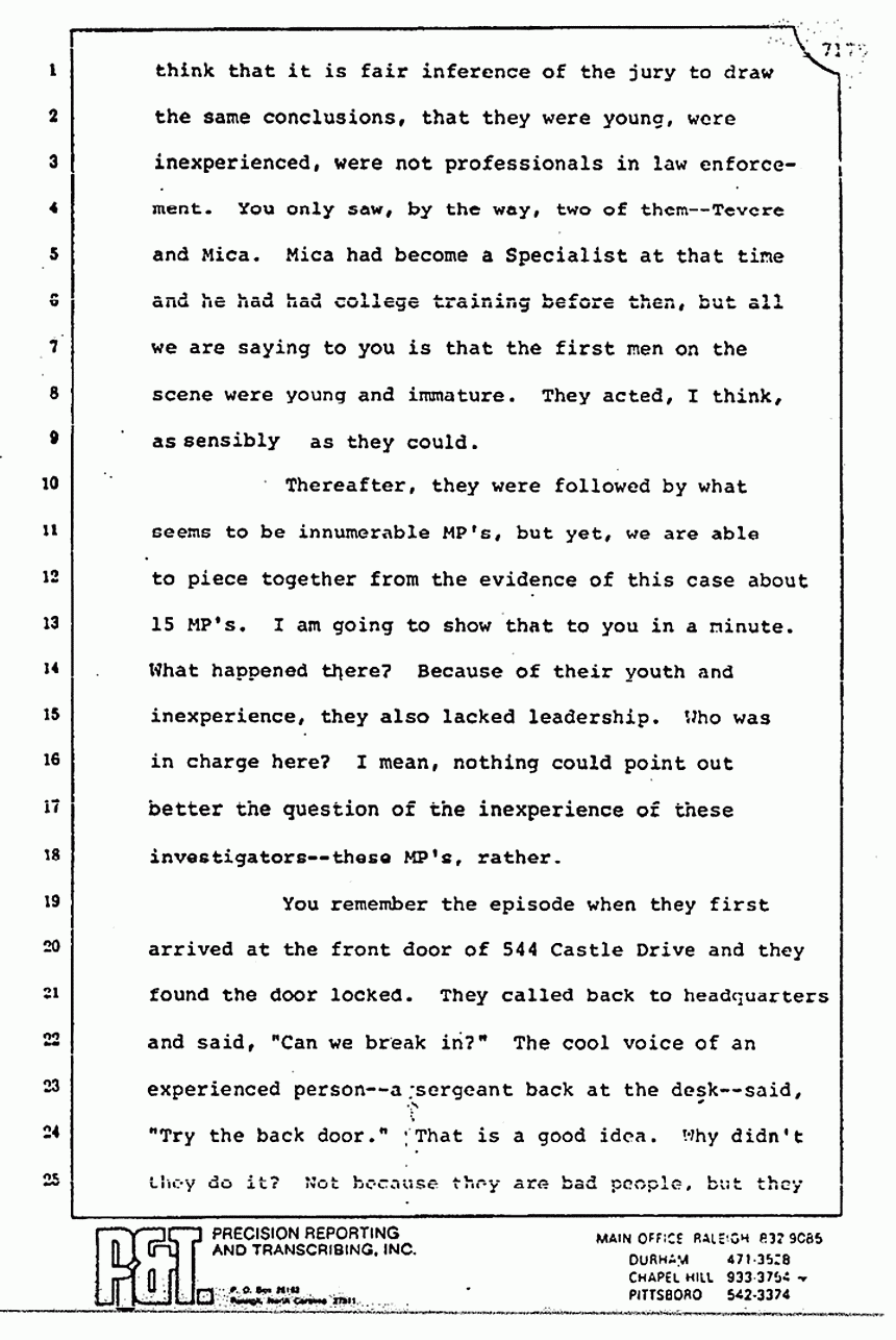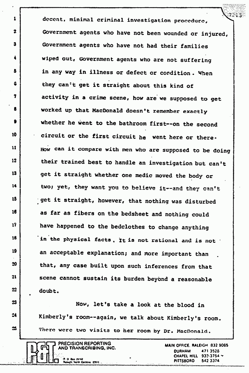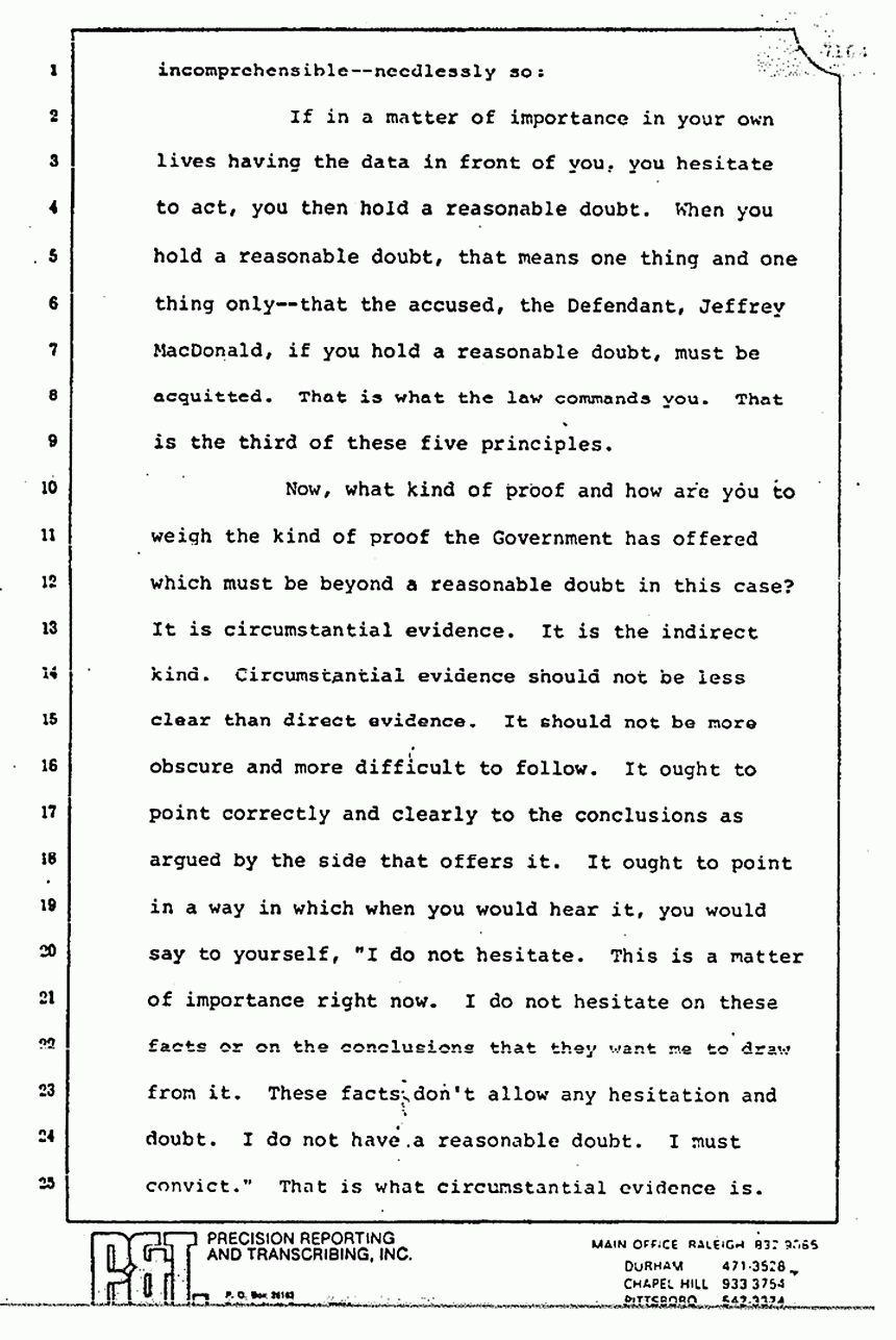 Mr. Segal has sought, and I might add, very capably, to try everybody but the Defendant. Helena Stoeckley is not on trial. The girl on the corner of Honeycutt and North Lucas is not on trial. The people in Mr. Milne's vision, or he said analogy, or whatever it really was, are not on trial. The CID and the FBI agents are not on trial, nor is the Army, the Special Forces, or the Justice Department on trial, nor are the Kassabs on trial. Truth shall prevail, we submit, but only if the jury, on conformity with its oath, makes no distinction as the law requires between circumstantial and direct evidence.
