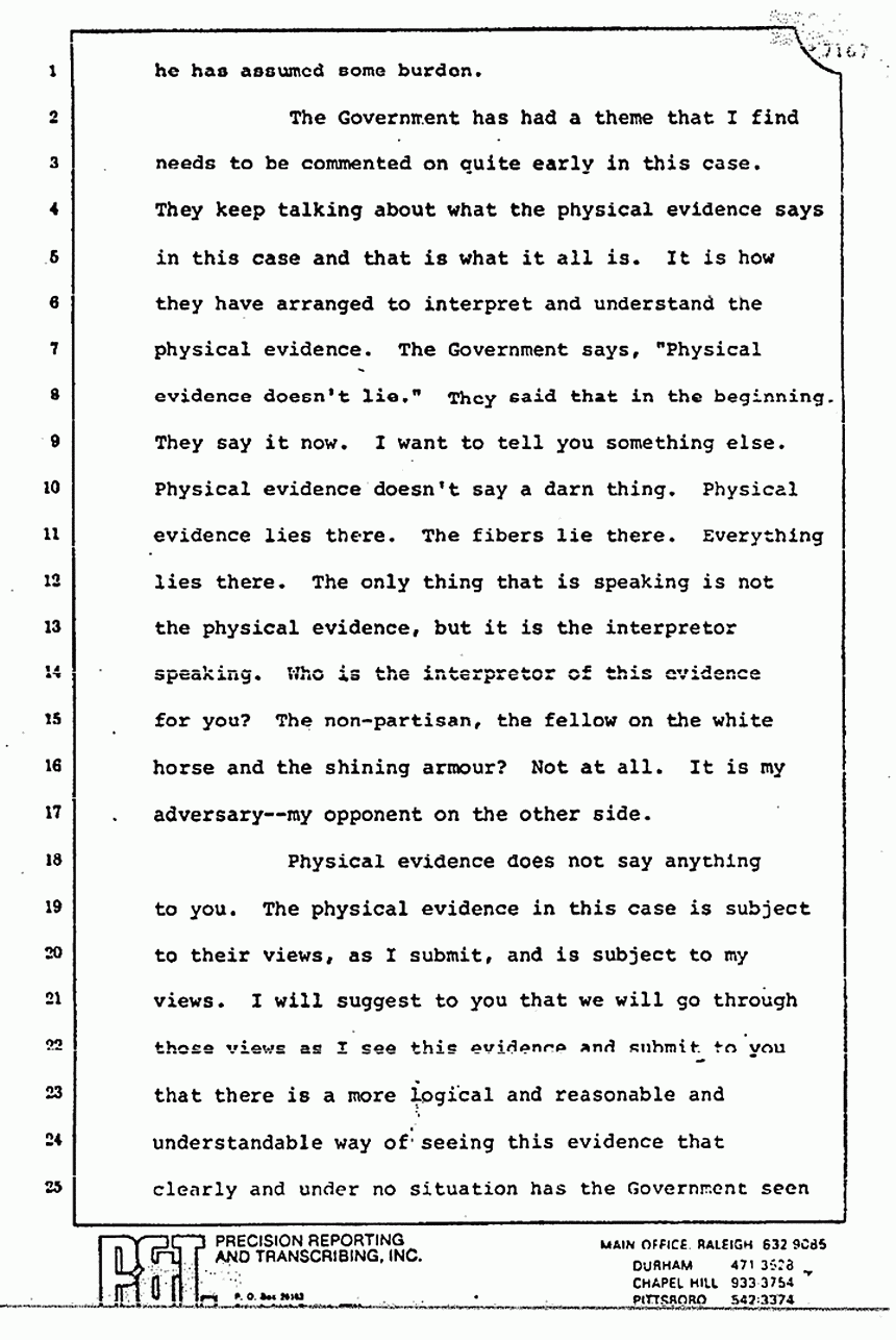 He says that the physical evidence doesn't say anything -- it doesn't speak. It is only attorneys speaking. I say to you that the physical evidence simply cries out an explanation. I heard this afternoon little straw men being set up that we did not raise and then being knocked over by the Defendant. He talked at great length about threads and fibers and his explanation for where they were. Isn't it interesting, ladies and gentlemen, that all these MPs and these people who were at the crime scene and tracked in and tracked out in the rain and all this other stuff -- why didn't they track some back into the living room from the master bedroom? There were a lot of MPs, according to the Defendant and the Government, in the master bedroom. Why weren't some of those threads somewhere else?