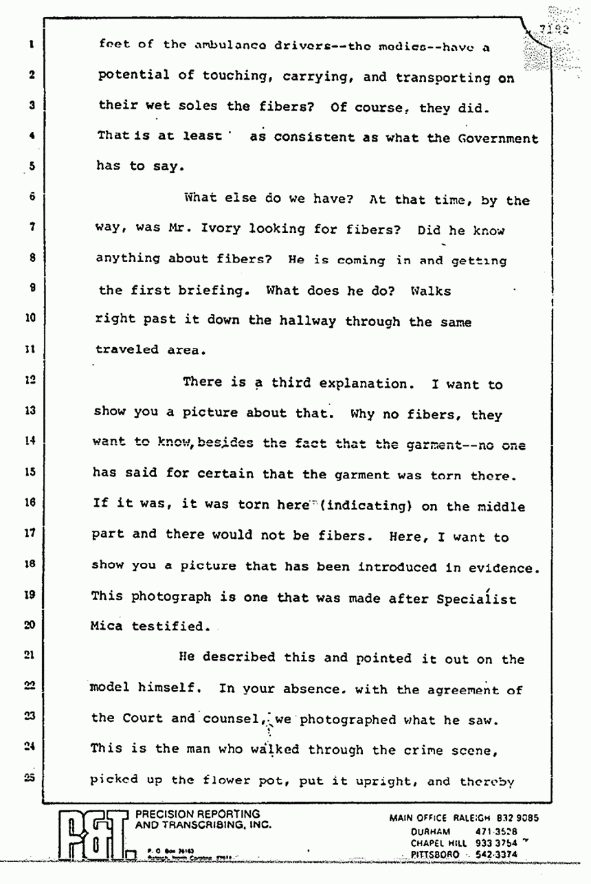 Things that were identified such as the Defendant's footprint in Kristen's room -- exiting Kristen's room -- is not affected by what remains unidentified. What Mr. Segal has tried to do -- and it was, I think, his duty -- is to get the jury's attention away from the physical evidence which we contend connects the Defendant and no one else to the murders -- such as his pajama top. He did this by dwelling on irrelevancies such as the flower pot and the feather. What they have to do with this crime, I submit, is irrelevant.