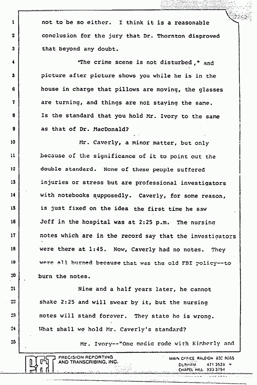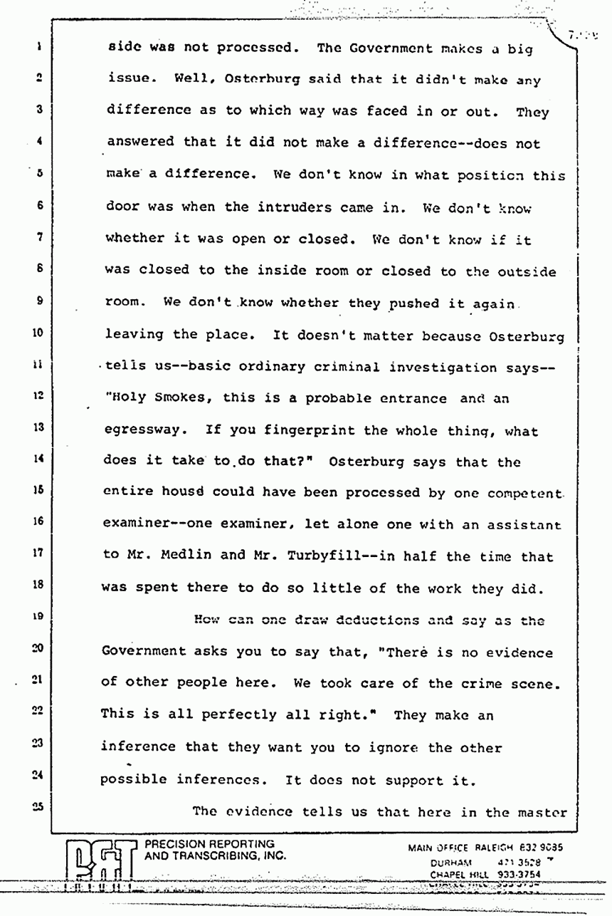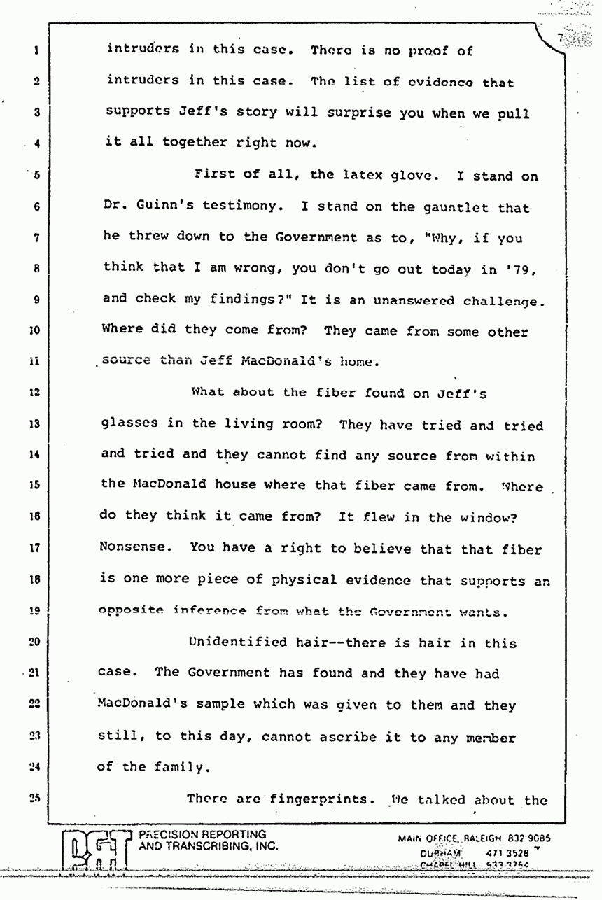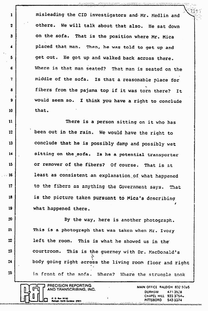He talks about the pajama top and where it was torn. I think by an implication he said that MacDonald said that it was ripped in the master bedroom. Huh-uh. MacDonald said that he took it off in the master bedroom and he did not hear a ripping sound. MacDonald said that he doesn't know where it was torn and he cannot come by his counsel and tell you, "Now, we do know where it was torn." In any event, we don't disagree necessarily on that. We believe it was torn in the master bedroom.