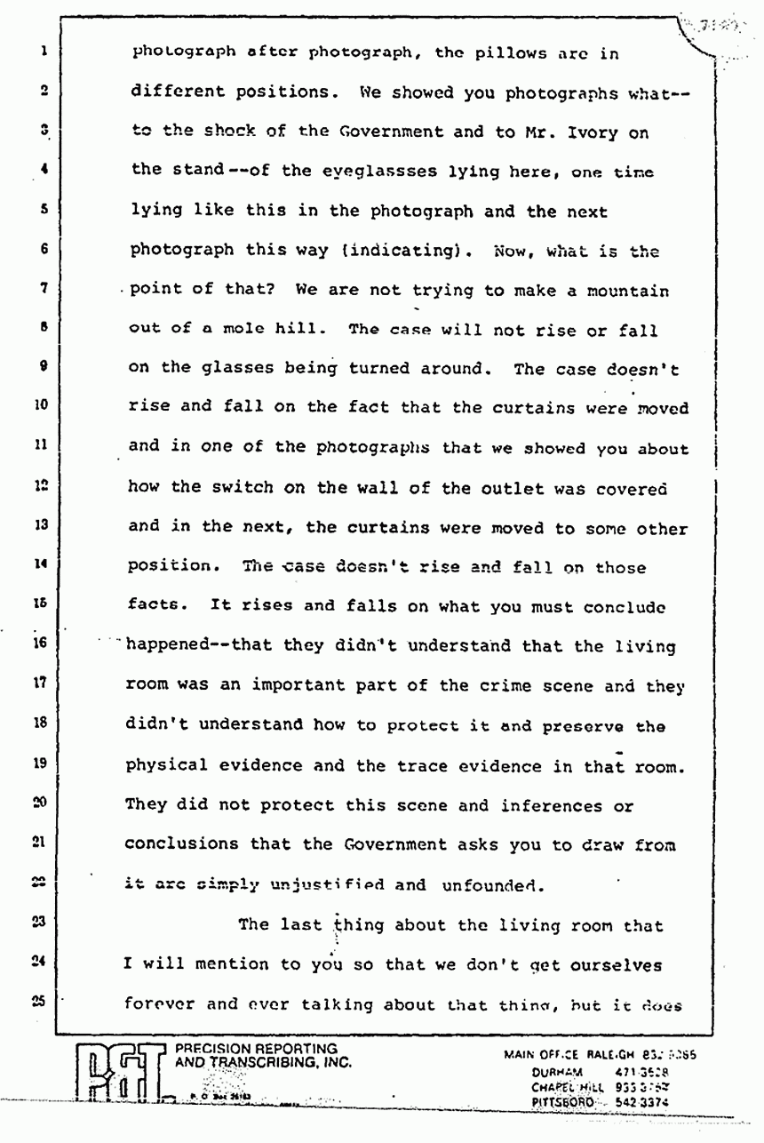 He talked at length about the crime scene and said we made fun of it. We don't intend to make fun of anything, and certainly not a serious crime scene like this, but I do fail to see the strong significance of the movement of things that have little or no evidentiary value. He even spoke about the glasses again today and said that there was blood on them. Yes, there was blood, and the testimony was that it was consistent with that of Kristen and inconsistent with that of the Defendant. He said that we were talking about the hospital at Hamlet and perhaps that is where it got on there. I don't recall that testimony ever coming or that argument ever coming from the Government -- maybe you do.