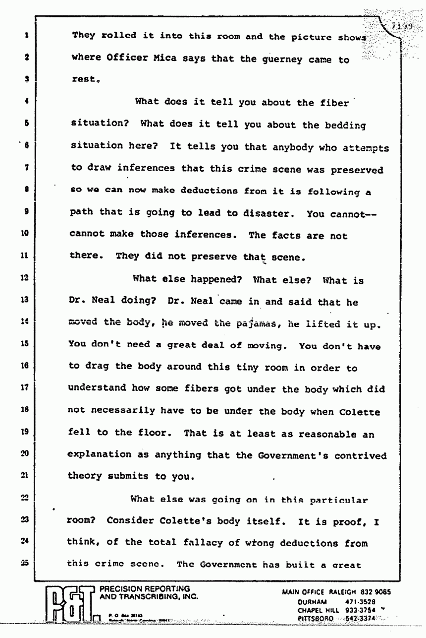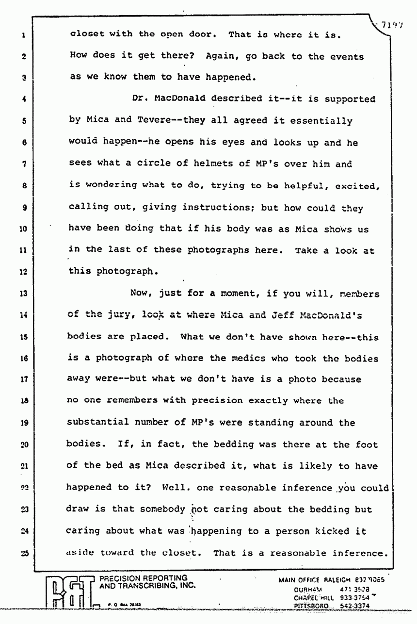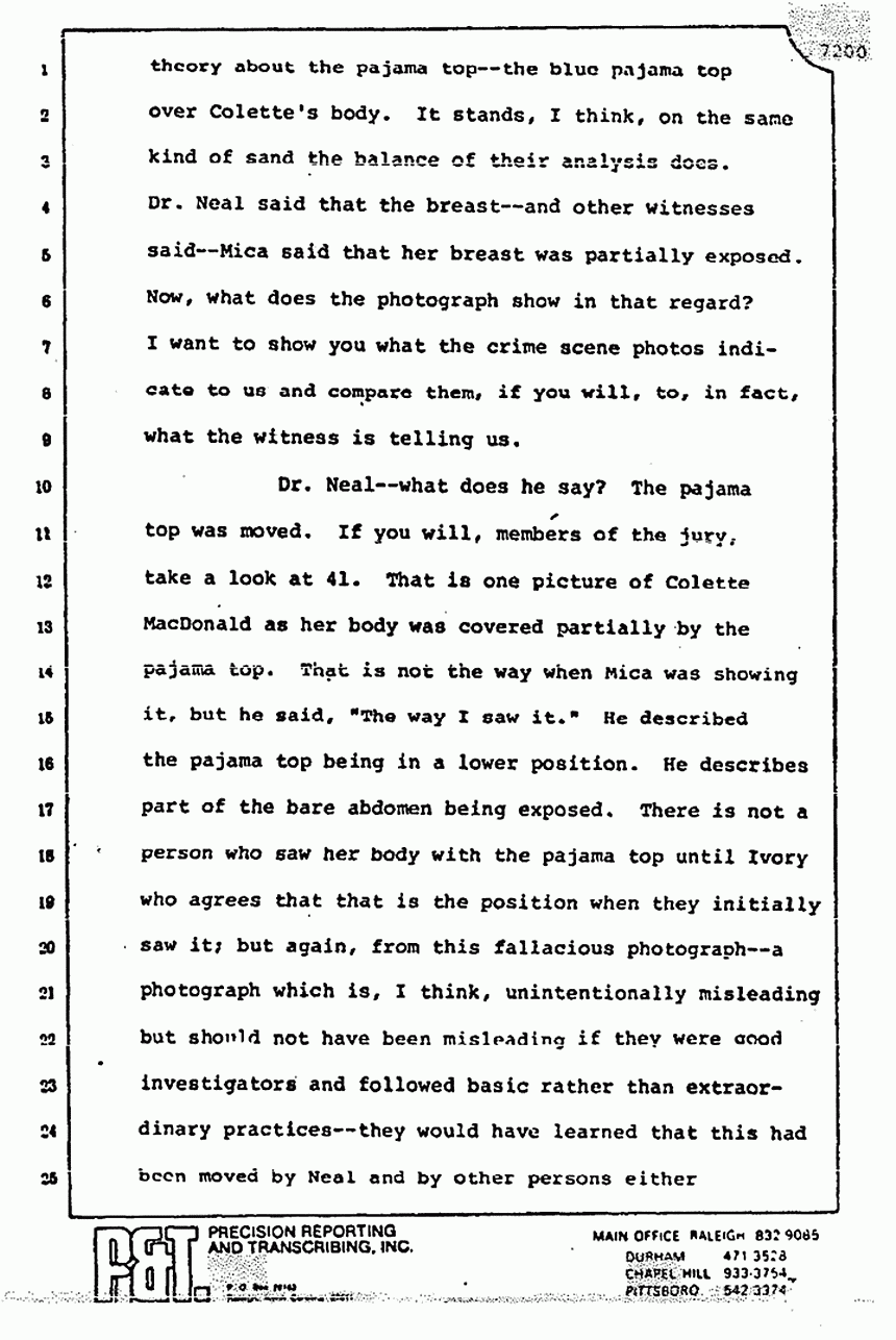 He talks about the movement of the bodies and he spoke of Dr. Neal. He forgot to tell you that Dr. Neal testified from the witness stand that all the photographs of the bodies -- or at least some of the photographs of the bodies -- were taken prior -- not after -- but prior to his checking the bodies. The picture of the pajama top on Colette MacDonald was first taken by James Alexander before Dr. Neal ever got there -- a little black and white Polaroid shot of it -- one of the first photographs, I think, introduced in the trial.