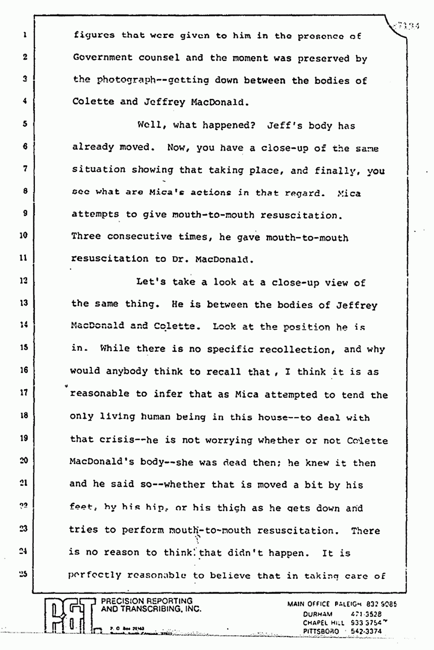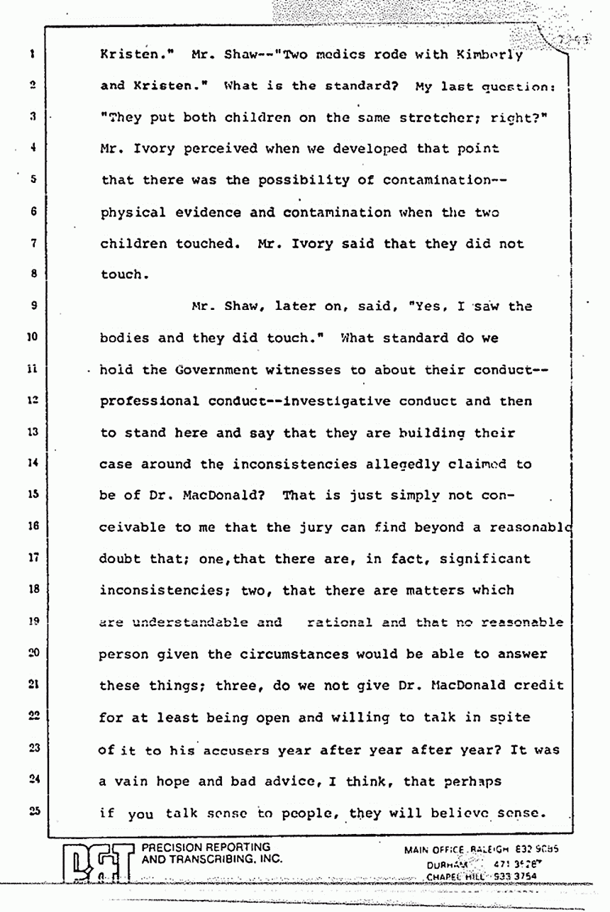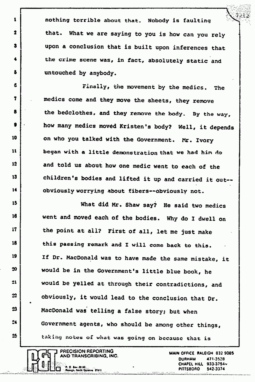 He talks about the movement of the bodies and he spoke of Dr. Neal. He forgot to tell you that Dr. Neal testified from the witness stand that all the photographs of the bodies -- or at least some of the photographs of the bodies -- were taken prior -- not after -- but prior to his checking the bodies. The picture of the pajama top on Colette MacDonald was first taken by James Alexander before Dr. Neal ever got there -- a little black and white Polaroid shot of it -- one of the first photographs, I think, introduced in the trial.