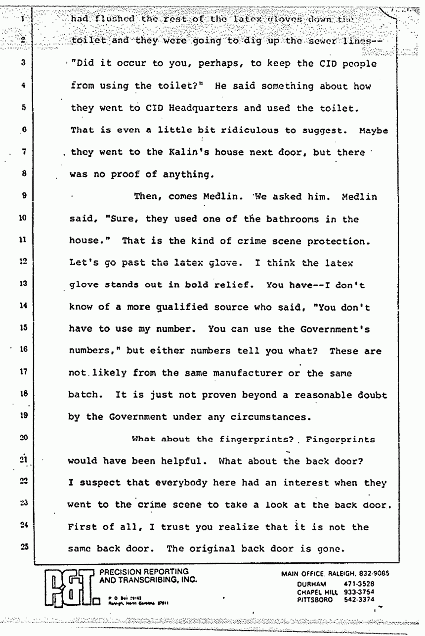We also have the piece of rubber -- the Perry-brand surgical latex gloves here -- and you have also got the Hilton bathmat. Also, you have debris under the trunk and legs of Colette, which match the purple cotton threads of the pajama top. I would ask you to find that from this evidence, the purple cotton threads from the pajama top were all over this master bedroom, and that they got there when that garment was ripped in the master bedroom and in no other fashion.