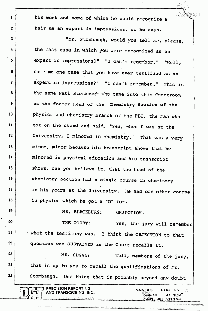 Shirley Green did not say, as I recall her testimony, that she did follow Paul Stombaugh's theories on exit and entry wounds. She said that she didn't. There is a big difference between did and didn't. You recall the FBI Report, and I mentioned it this morning and I am sorry, but I have got to mention it again, Paul Stombaugh said that he saw several holes -- not all as the Defendant has correctly stated -- that had the appearance of entry holes and some that had the appearance of exit holes. He also concluded -- a couple of paragraphs down -- that because he got the pajama top a year and a half after the crime, it was impossible to determine whether or not the holes were entry or exit holes. I submit to you that their attack on the pajama top reconstruction is based on a false premise.