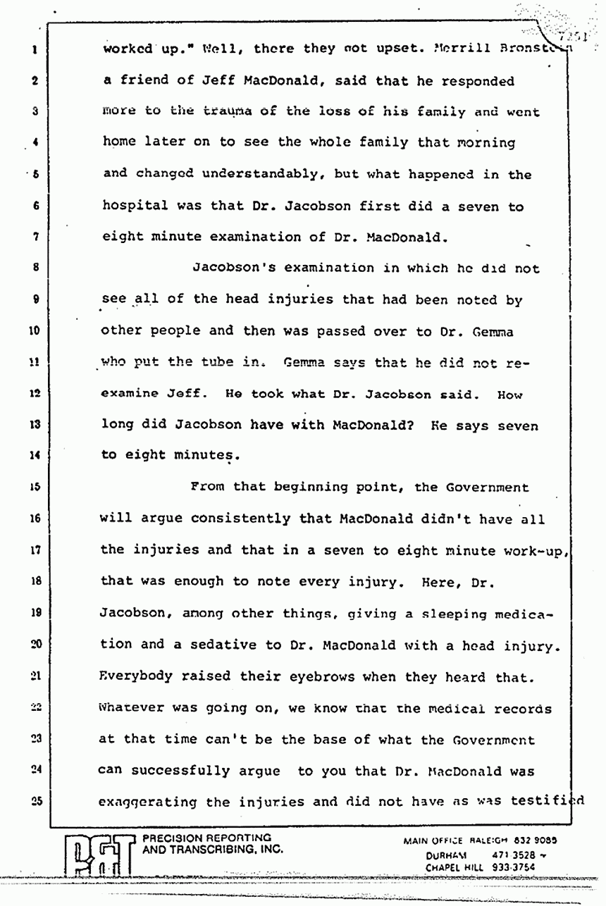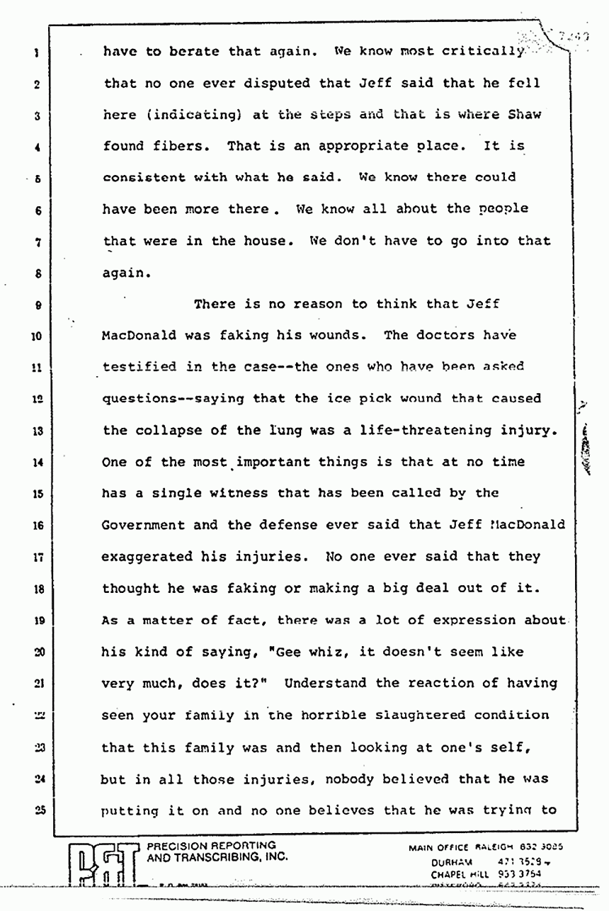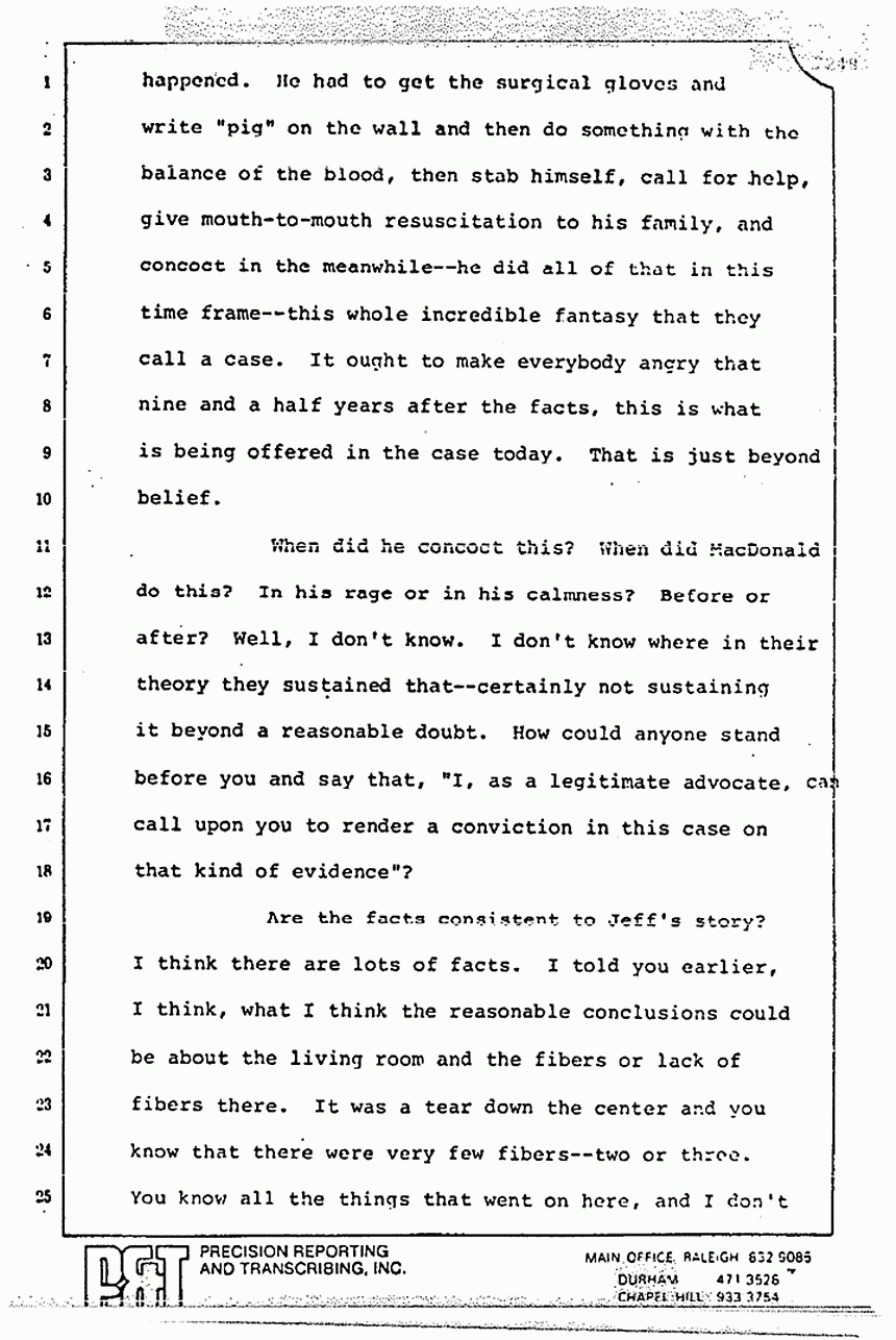 What about Jeff's injuries? It is clear that no doctor with Jeff MacDonald's intelligence would stab himself in the place he did because just in case the person didn't get your message on the phone and the help didn't get to you, you would be dead. Now, what kind of brilliant scheme is that, to hide horrendous murders by taking an injury in a place where you just might die yourself? Jeff is either the intelligent man that even the Government concedes he is, or he is the lunatic who hasn't planned this out very carefully is what the Government's inferences would have you believe.