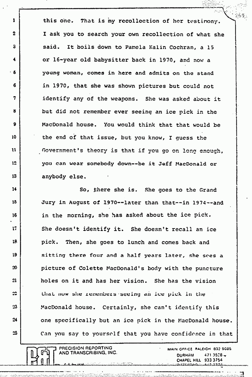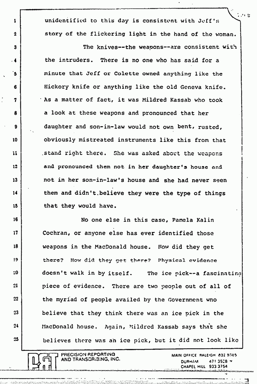No one else in this case, Pamela Kalin Cochran, or anyone else has never identified those weapons in the MacDonald house. How did they get there? How did they get there? Physical evidence doesn't walk in by itself. The ice pick -- a fascinating piece of evidence. There are two people out of all of the myriad of people availed by the Government who believe that they think there was an ice pick in the MacDonald house. Again, Mildred Kassab says that she believes there was an ice pick, but it did not look like this one. That is my recollection of her testimony. I ask you to search your own recollection of what she said. It boils down to Pamela Kalin Cochran, a 15 or 16-year old babysitter back in 1970, and now a young woman, comes in here and admits on the stand in 1970, that she was shown pictures but could not identify any of the weapons. She was asked about it but did not remember ever seeing an ice pick in the MacDonald house. You would think that that would be the end of that issue, but you know, I guess the Government's theory is that if you go on long enough, you can wear somebody down -- be it Jeff MacDonald or anybody else.