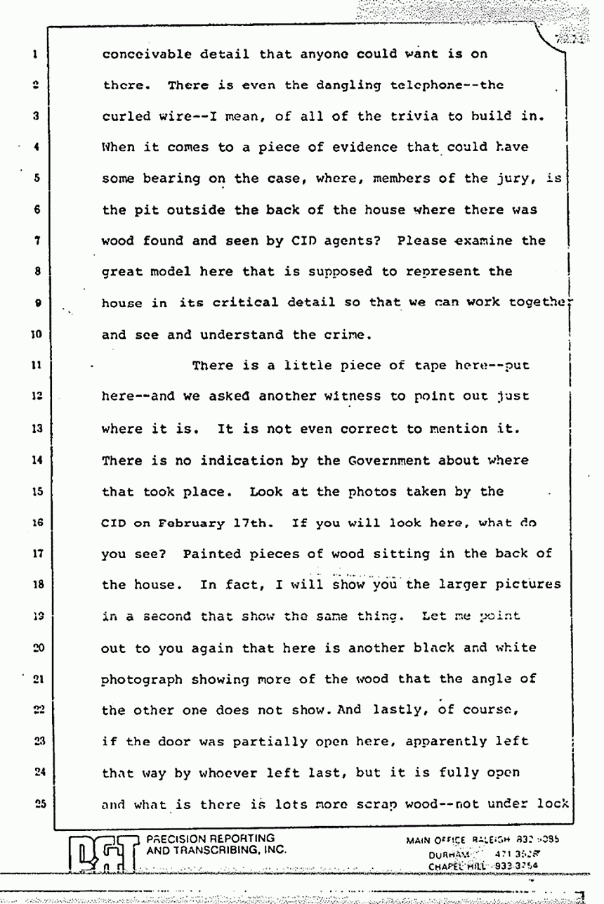 On this model, members of the jury, every conceivable detail that anyone could want is on there. There is even the dangling telephone -- the curled wire -- I mean, of all the trivia to build in. When it comes to a piece of evidence that could have some bearing on the case, where, members of the jury, is the pit outside the back of the house where there was wood found and seen by CID agents? Please examine the great model here that is supposed to represent the house in its critical detail so that we can work together and see and understand the crime.