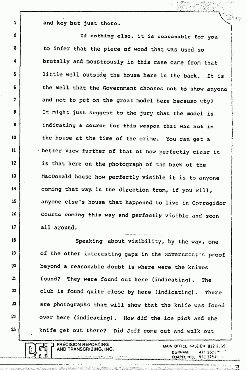 If nothing else, it is reasonable for you to infer that the piece of wood that was used so brutally and monstrously in this case came from that little well outside the house here in the back. It is the well that the Government chooses not to show anyone and not to put on the great model here because why? It might just suggest to the jury that the model is indicating a source for this weapon that was not in the house at the time of the crime. You can get a better view further of that of how perfectly clear it is that here on the photograph of the back of the MacDonald house how perfectly visible it is to anyone coming that way in the direction from, if you will, anyone else's house that happened to live in Corregidor Courts coming this way and perfectly visible and seen all around.