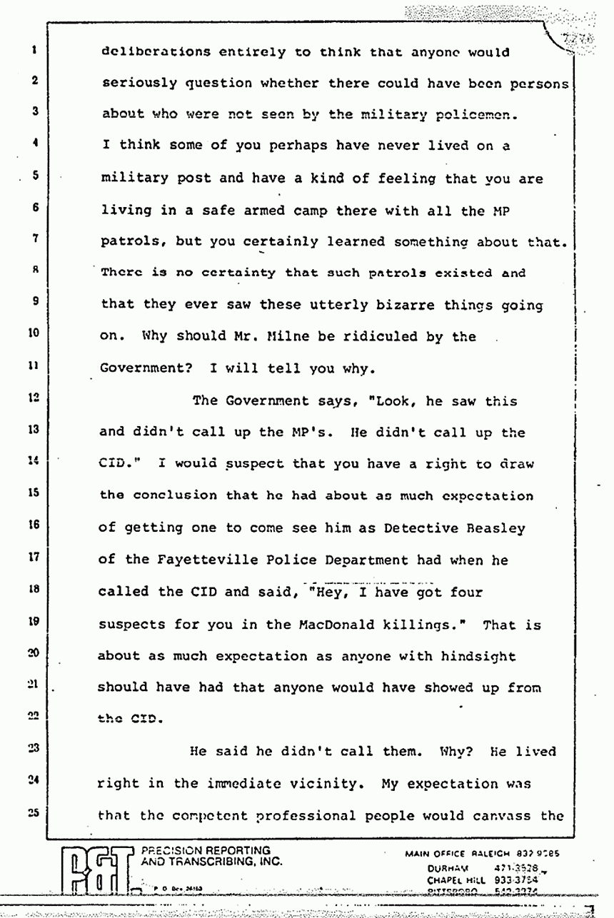 The Government says, "Look, he saw this and didn't call up the MPs. He didn't call up the CID." I would suspect that you have a right to draw the conclusion that he had about as much expectation of getting one to come see him as Detective Beasley of the Fayetteville Police Department had when he called the CID and said, "Hey, I have got four suspects for you in the MacDonald killings." That is about as much expectation as anyone with hindsight should have had that anyone would have showed up from the CID.