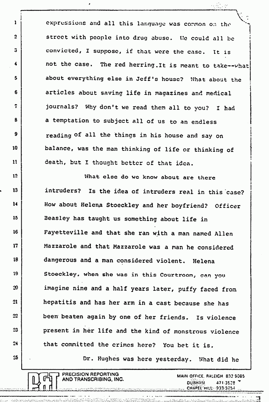 What else do we know about are there intruders? Is the idea of intruders real in this case? How about Helena Stoeckley and her boyfriend? Officer Beasley has taught us something about life in Fayetteville and that she ran with a man named Allen Mazerolle and that Mazerolle was a man he considered dangerous and a man considered violent. Helena Stoeckley, when she was in this Courtroom, can you imagine nine and a half years later, puffy-faced from hepatitis and has her arm in a cast because she has been beaten again by one of her friends. Is violence present in her life and the kind of monstrous violence that committed the crimes here? You bet it is.