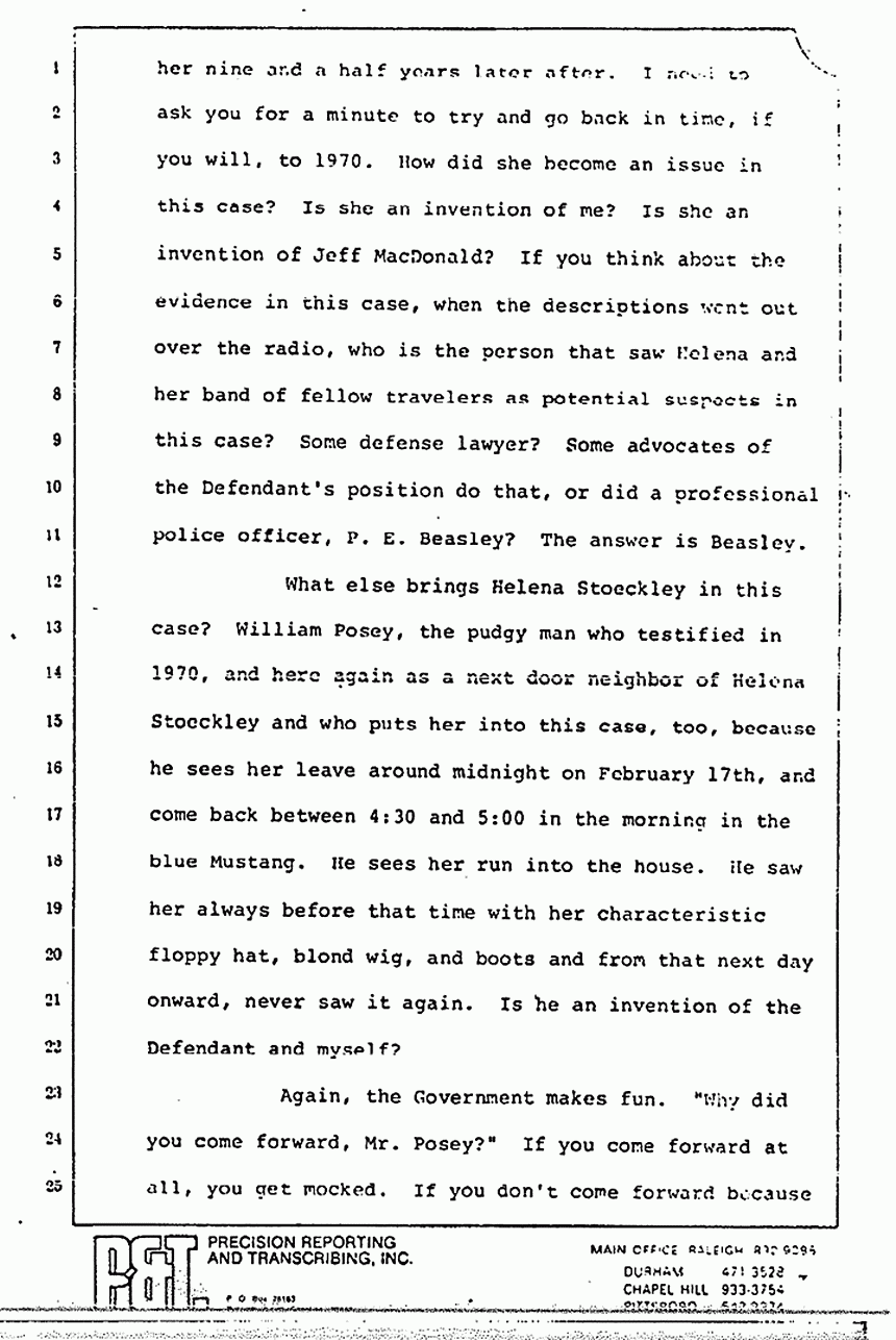 I want to talk to you a bit now about the last area that I want to talk to you about and then ask my colleague, Wade Smith, to talk a bit about something else. I will make it brief. The question here is what is the role of Helena Stoeckley in this case. Again, we are like living in a time warp. We see her nine and a half years later after. I need to ask you for a minute to try and go back in time, if you will, to 1970. How did she become an issue in this case? Is she an invention of me? Is she an invention of Jeff MacDonald? If you think about the evidence in this case, when the descriptions went out over the radio, who is the person that saw Helena and her band of fellow travelers as potential suspects in this case? Some defense lawyer? Some advocates of the Defendant's position do that, or did a professional police officer, P. E. Beasley? The answer is Beasley.