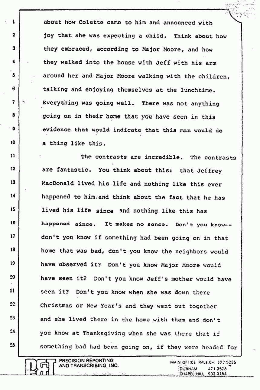 The contrasts are incredible. The contrasts are fantastic. You think about this: that Jeffrey MacDonald lived his life and nothing like this ever happened to him; and think about the fact that he has lived his life since and nothing like this has happened since. It makes no sense. Don't you know -- don't you know if something had been going on in that house that was bad, don't you know the neighbors would have observed it? Don't you know that Major Moore would have seen it? Don't you know Jeff's mother would have seen it? Don't you know when she was down there Christmas or New Year's and they went out together and she lived there in the home with them and don't you know at Thanksgiving when she was there that if something had been going on, if they were headed for a calamity like this, she would have known it. Others would have known it. I say to you, ladies and gentlemen of the jury, that if you will examine the testimony of the witnesses who took the stand for Jeff, they are little windows into that home, and you can look into any of the windows -- the little windows into the home. All of the witnesses who came and said that they had visited recently there, they give you a window into the home.